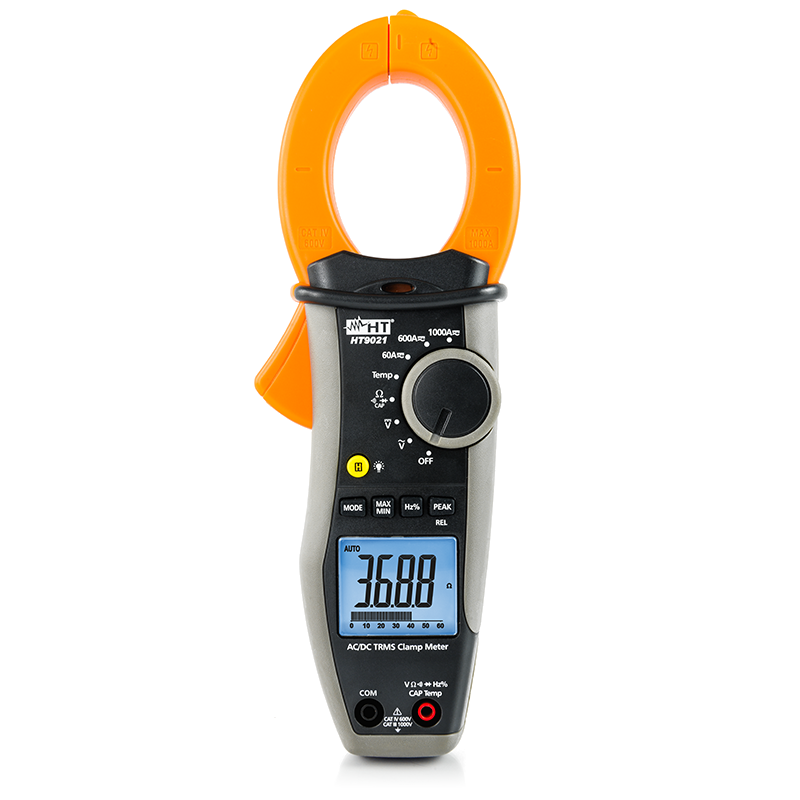 Токоизмерительные клещи HT9021 с возможностью измерения температуры. Измеряют переменный/постоянный ток до 1000 ампер в True RMS. Категория безопасности CAT IV и CAT III 1000 В в соответствии со стандартом безопасности IEC/EN61010-1.