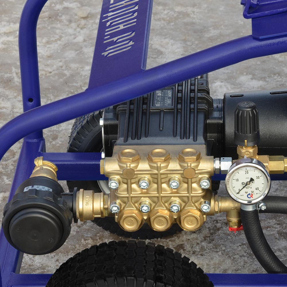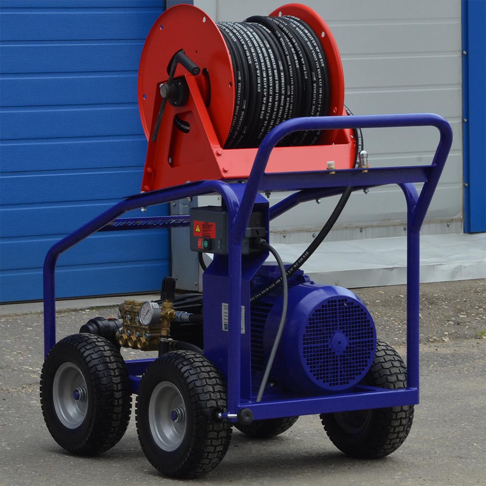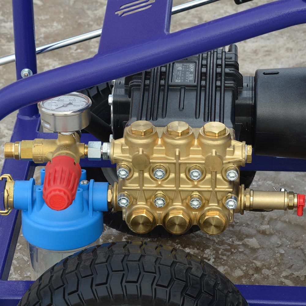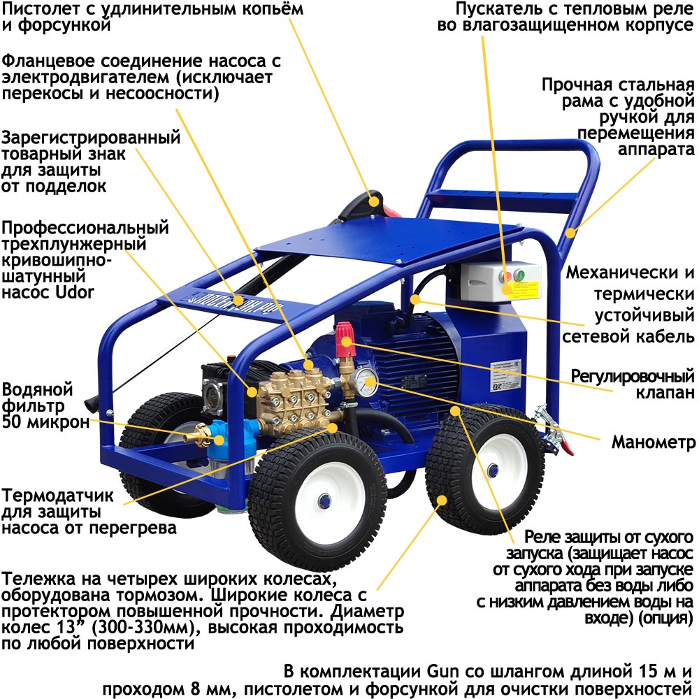 Аппарат высокого давления производится на базе электрического двигателя и комплектуется надежным насосом производства Италии.