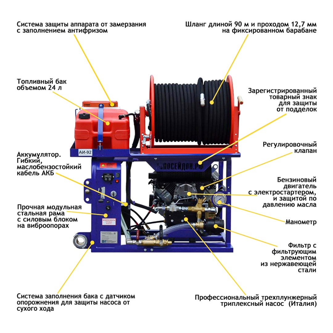 | Особенности | • Заполнение водой: вывод разъема ГЦ-50 • Управление потоком с помощью регулятора давления и трехходового крана, что обеспечивает легкость пуска двигателя и долгую работу регулятора давления; • Оснащен ручным шлангоукладчиком • Топливный бак 24 литра (вмещается канистра 20 литровая стандартная) • Полноценная АКБ (45 мА/ч) • Система для защиты от замерзания • Идеально для монтажа в прицеп • Барабан залива с возможностью интеграции в раму силового блока (опция) |