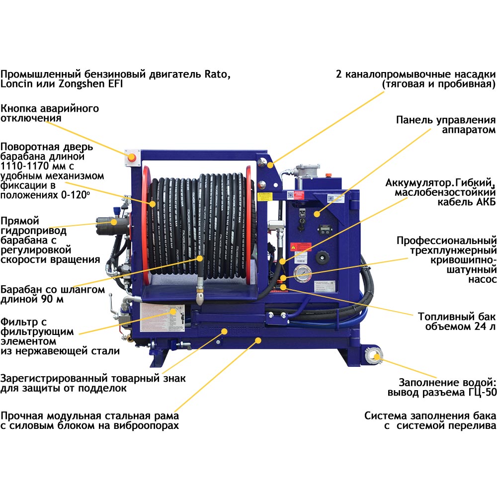 | Особенности | - Оснащение аппарата дистанционным управлением (аварийное отключение, старт/стоп, обороты двигателя, смотка/размотка барабана). Актуально для версий с гидроприводом барабана