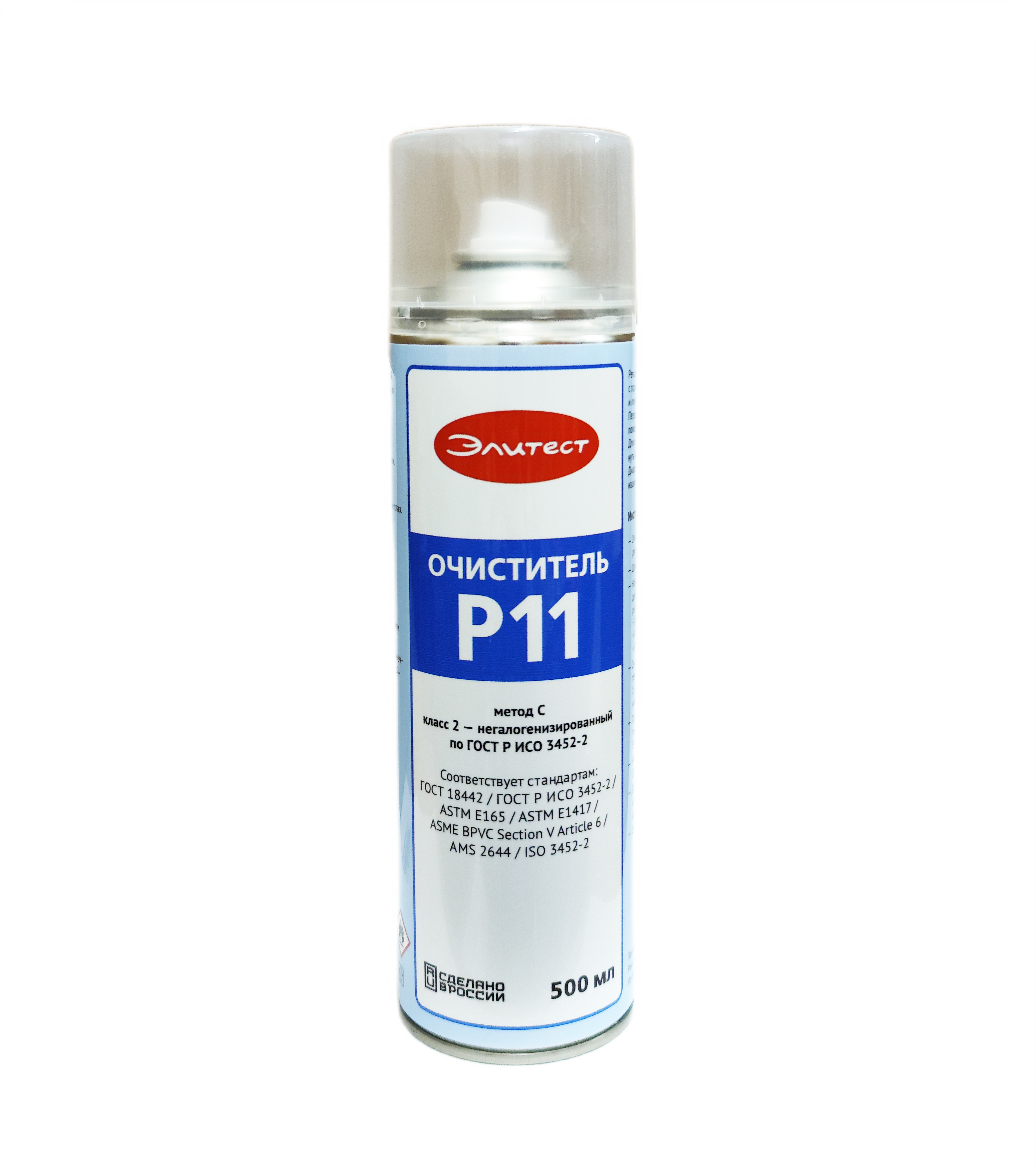 Элитест Р11 — очиститель на основе спирта. Не содержит в составе ацетона и не имеет резкого запаха. Эффективно удаляет загрязнения, в том числе масляные и жирные, при этом не вымывая пенетрант из дефекта. Очиститель не содержит твердых и растворенных нелетучих примесей, благодаря чему быстро высыхает и не оставляет на поверхности следов.