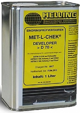 Перед применением проявитель Helling D70 необходимо встряхивать. Основа – растворитель – воспламеним, вследствие чего следует избегать открытого пламени. Содержит мало серы, соды, хлора и других галогенов, что делает его надежным при работе с титаном и сплавами с высоким содержанием никеля, находящими применение в ядерных технологиях.