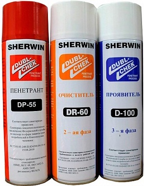 Возможна поставка наборов для капиллярной (цветной) дефектоскопии SHERWIN как комплектами, так и отдельно очистителя DR-60, проявителя D-100 или пенетранта DP-51.