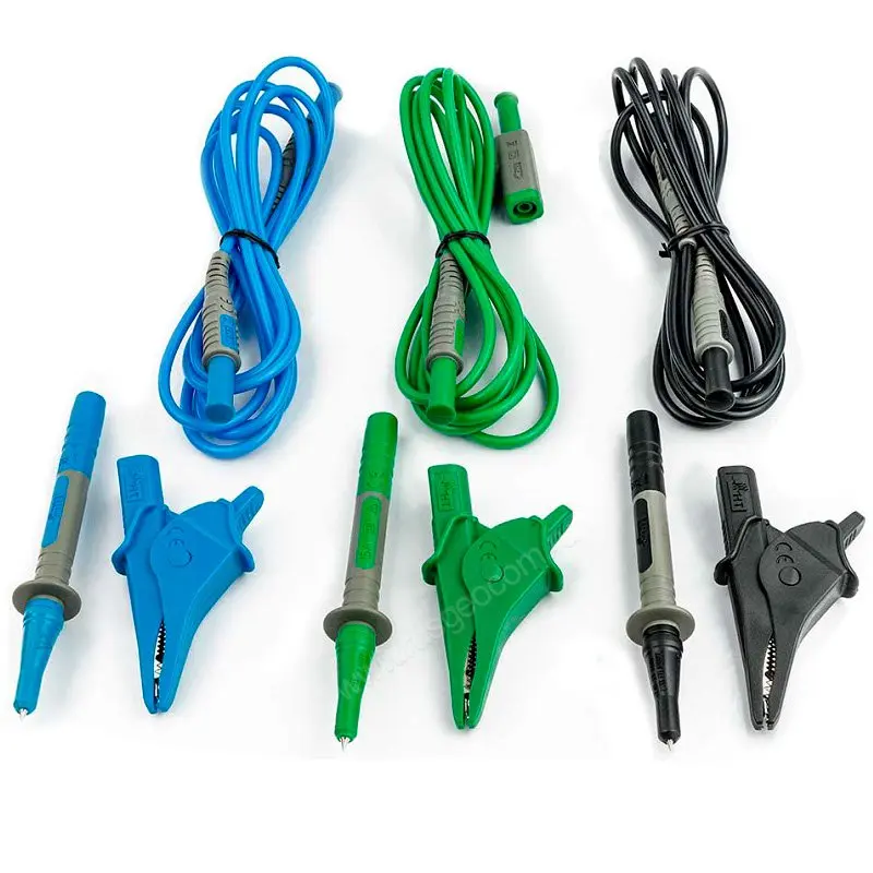 Комплект из 3-х кабелей, 3 зажимов "крокодил" и 1 наконечника тестового провода для измерителей параметров электрических сетей АКИП-8401 и АКИП-8402.