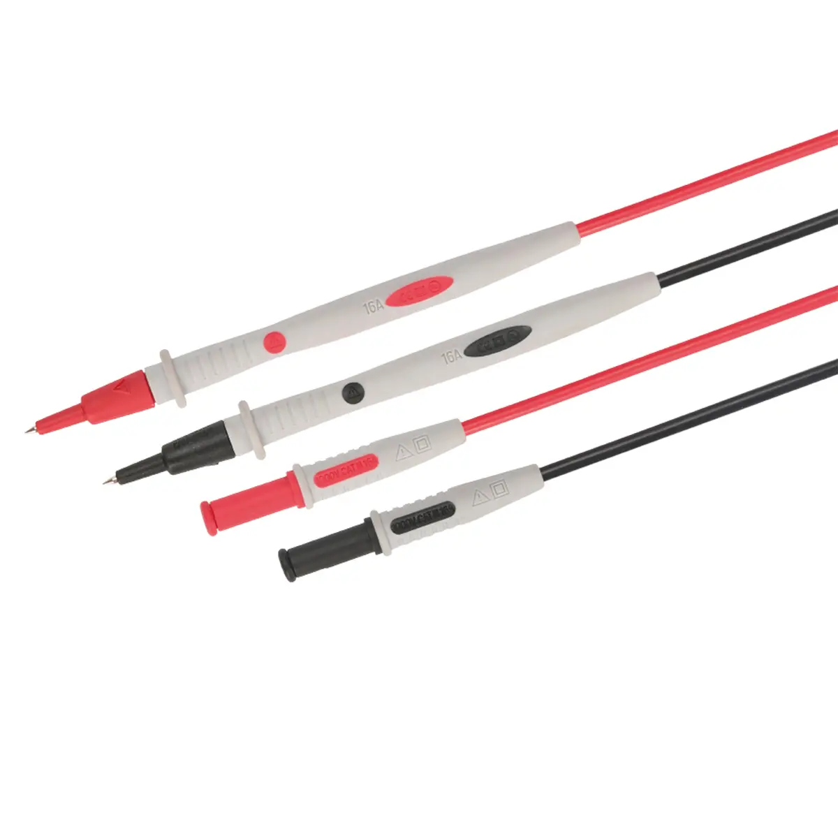 Комплект измерительных проводов RGK TP2-03 включает в себя красный и черный кабели с несъемными щупами. Набор аксессуаров рассчитан на работу с токами повышенного номинала до 16 А. Увеличенная, по сравнению с типовыми измерительными проводами, длина соединительных кабелей дает возможность производить контактные измерения при значительном удалении прибора от точек замера, например, в ходе тестирования/диагностики стационарного электросилового оборудования с мультиметром или другим устройством.