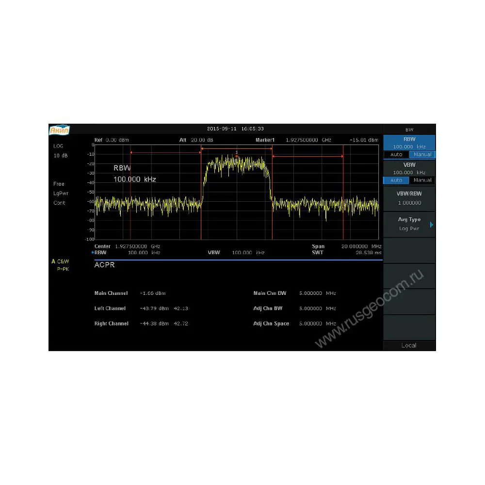 Программная опция расширенных измерительных функций: измерение мощности в канале и соотношение мощностей в смежных каналах, измерение мощности во временной области, измерение ширины занимаемой полосы частот.