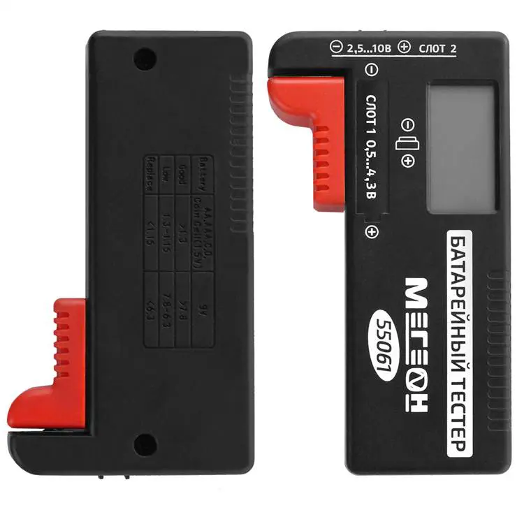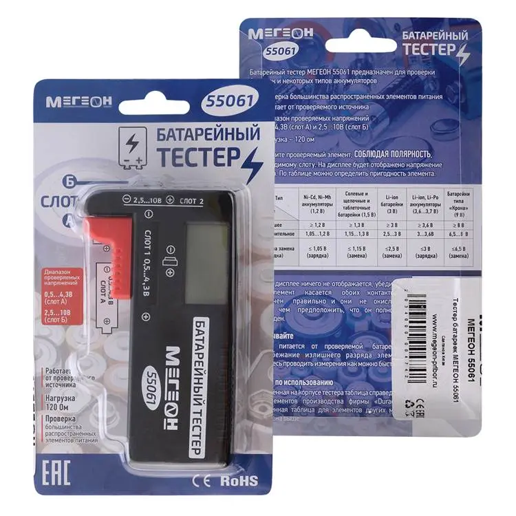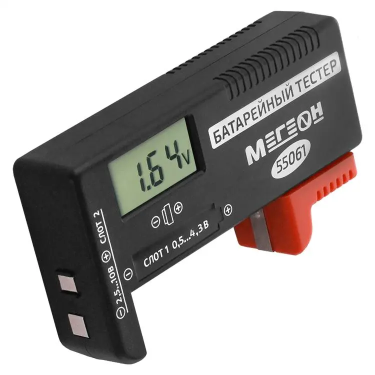 Тестер батареек МЕГЕОН 55061 представляет собой компактный электроизмерительный цифровой прибор бытового класса, предназначенный для быстрой проверки элементов питания постоянного тока наиболее популярных типоразмеров, с оценкой возможности их использования по прямому назначению. Изделие оборудовано двумя измерительными контурами с отдельными слотами разной конструкции, с рабочими диапазонами 0.5 – 4.3 В и 2.5 – 10 В, за счет чего обеспечивается его универсальность. С целью обеспечения правильности подключения электроды измерителя снабжены маркировкой "–" и "+".
