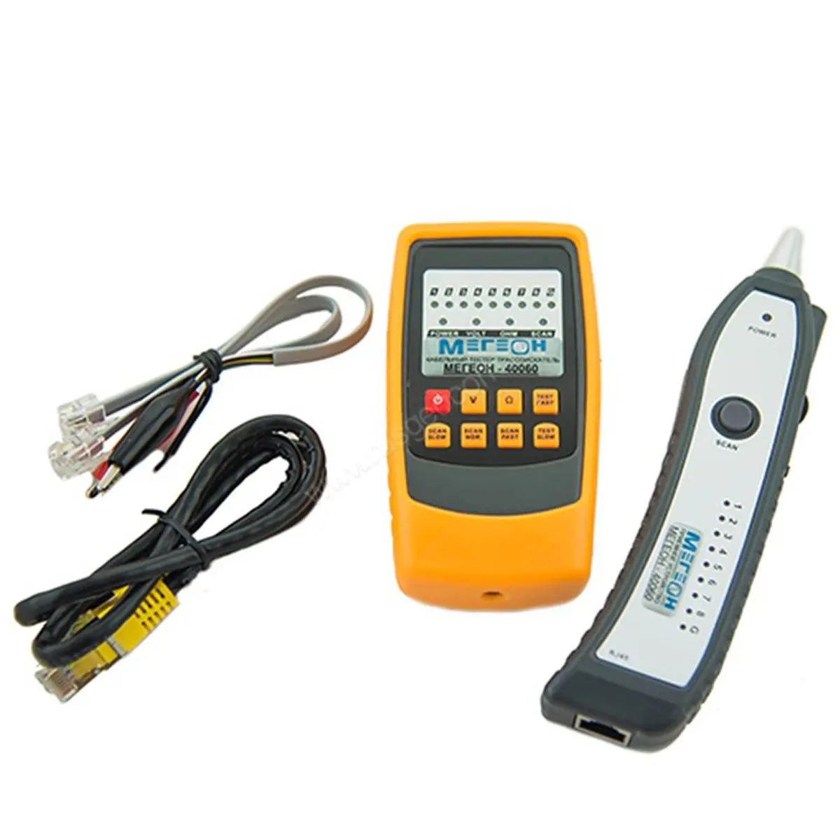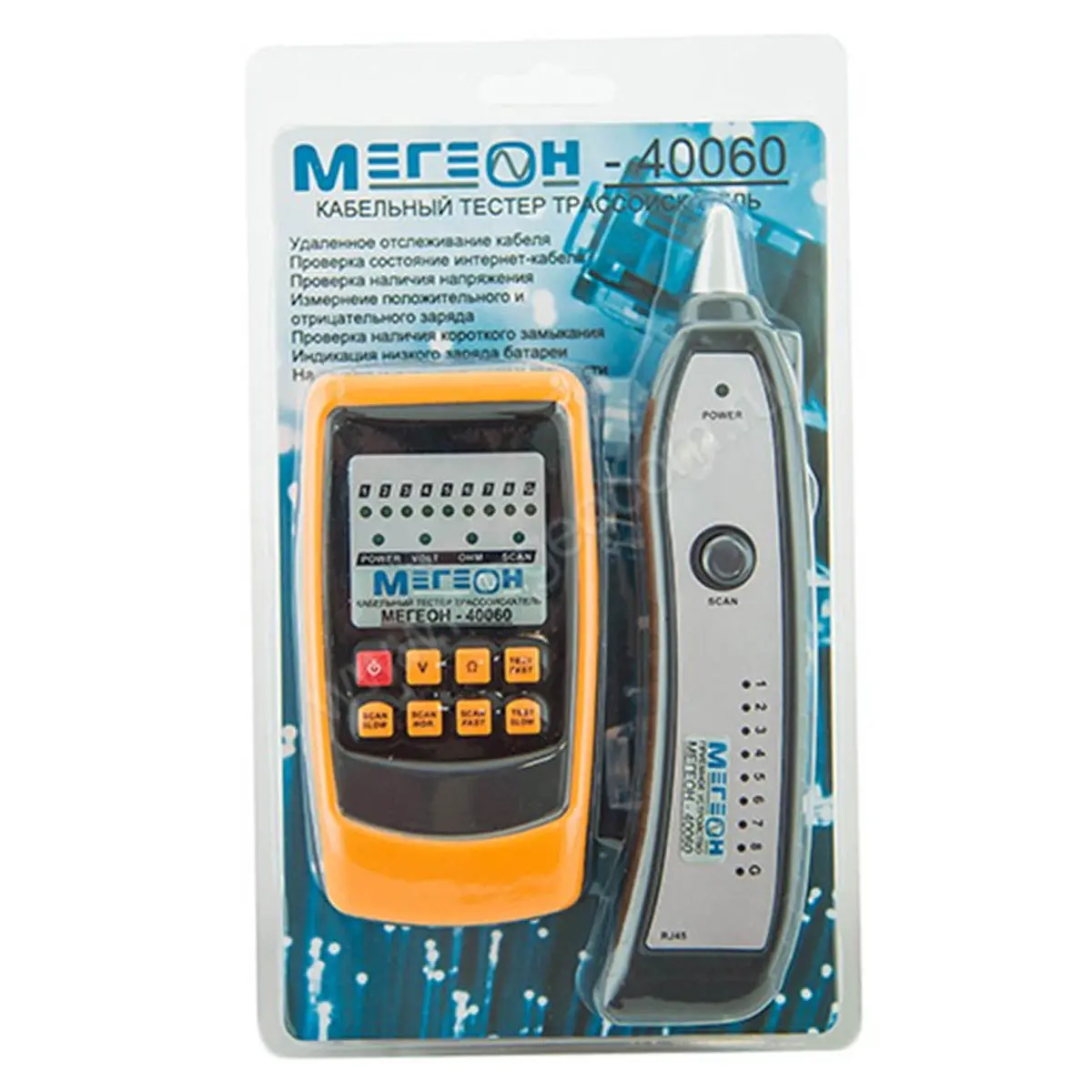 Из основных отличительных особенностей стоит отметить функцию обнаружения и отслеживания кабеля, поиск неисправностей в проводке и проведение тестирования соединения кабеля. Используя тестер Мегеон 40060, Вы можете без особого труда определить КЗ в линиях связи, а так же определить наличие положительного или отрицательного напряжения. Максимальное расстояние отслеживания кабеля составляет один километр.