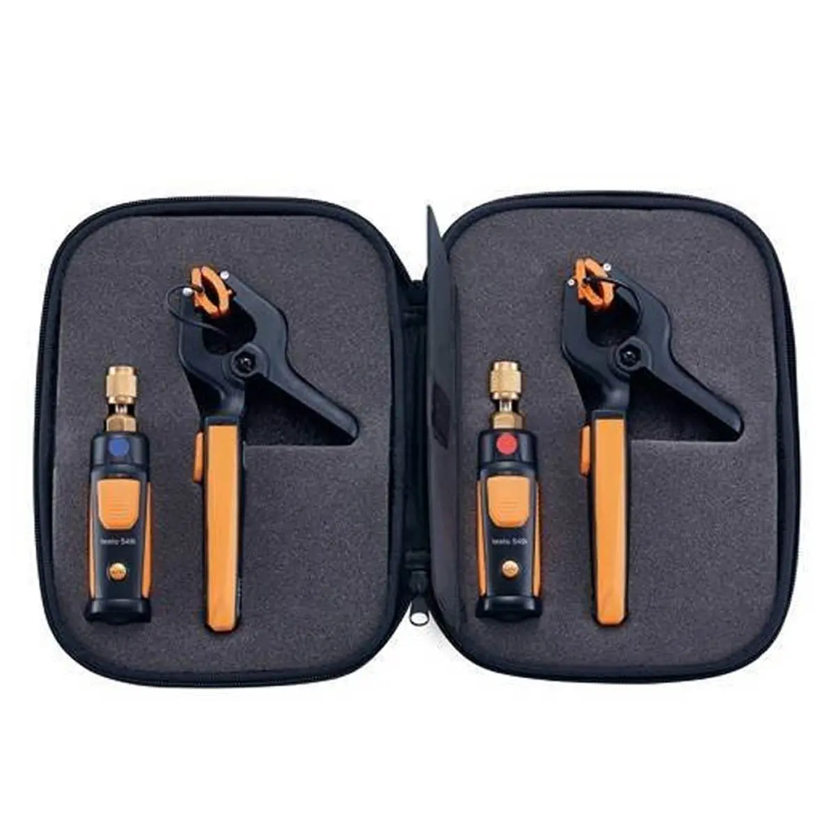 Комплект для холодильных систем Testo (Refrigeration set) представляет собой набор компактных интеллектуальных инструментов от компании Testo AG, применяемый в пуско-наладочных и диагностических работах, а также в сервисном обслуживании стационарной и мобильной климатической техники, холодильных и морозильных агрегатов, тепловых насосов и т.п. Комплект создан на основе беспроводных смарт-зондов, управляемых дистанционно и передающих результаты измерений через Bluetooth на смартфон/планшет с ПО Testo Smart Probes. В состав набора включены: