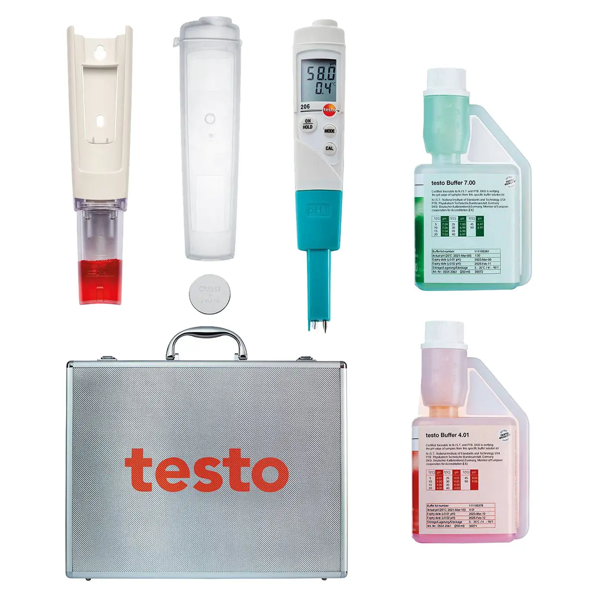 Стартовый комплект Testo 206-pH1 - комбинация из карманного анализатора температуры от 0 до + 60 °C, 2 пузырьков с буферными растворами для калибровки анализатора, защитного колпачка и чемоданчика для переноски. Прибор предназначен для определения степени кислотности жидких веществ как в пищевой, так и в химической индустрии. Полученные результаты измерений оперативно отображаются на дисплее устройств. Конструкция зондов надежно защищена от утечек, к тому же, после использования их легко можно промыть под краном.