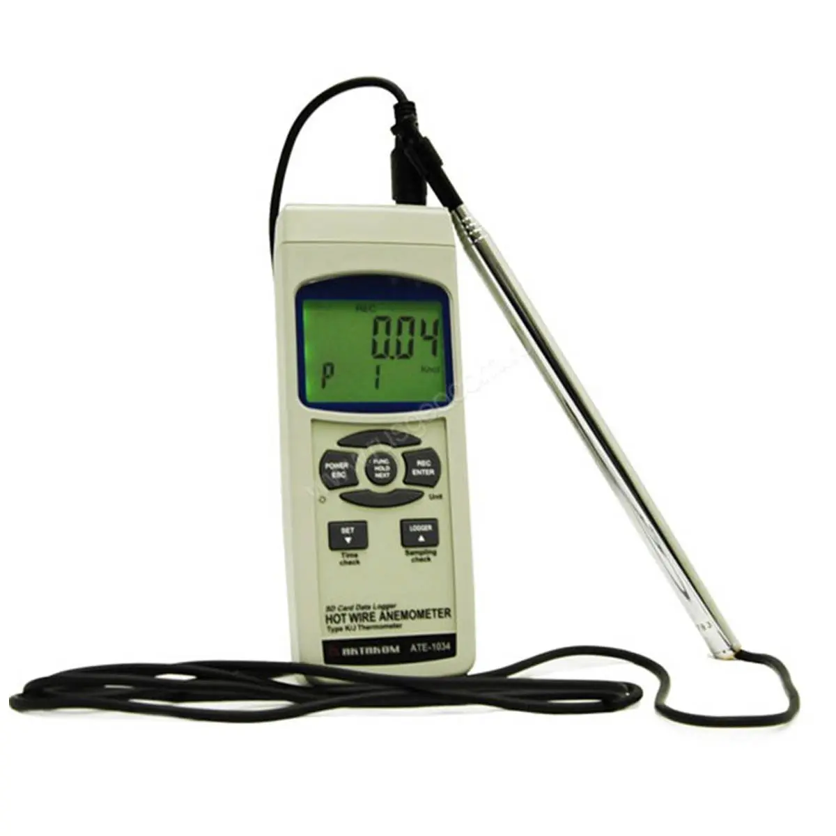 Портативный термоанемометр с возможностью температурных измерений, работающий по принципу охлаждения воздушным потоком нагретой нити. В приборе использован выносной датчик — миниатюрный стеклянный термистор, который размещается в малогабаритной измерительной головке диаметром 12 мм на телескопической ручке. Может применяться для измерения параметров воздушного потока, как на вентиляционных решетках, так и непосредственно в воздуховодах. В термоанемометре АТЕ-1034 имеется возможность сохранения измеренных данных на SD-карту в формате Excel в режиме реального времени без!!! использования специального программного обеспечения.