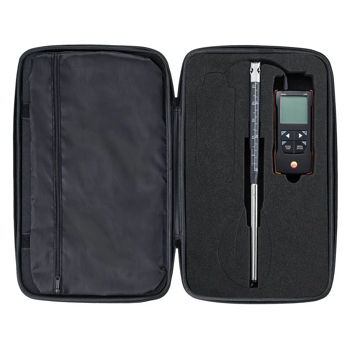 За счет одновременного отображения скорости и расхода на дисплее с подсветкой анемометр Testo 416 характеризуется высокой наглядностью. Для получения более точных результатов предусмотрена возможность выполнения продолжительных измерений с усреднением полученных показателей по заданному числу замеров или времени. Наличие звуковой сигнализации позволяет быстро проверять соответствие отслеживаемых параметров заданным нормативным показателям, без обязательного считывания результатов измерений. На телескопической рукоятке нанесена сантиметровая и дюймовая шкала, что дает возможность контролировать глубину погружения датчика, размещая его в оптимальном положении относительно центра воздуховода.