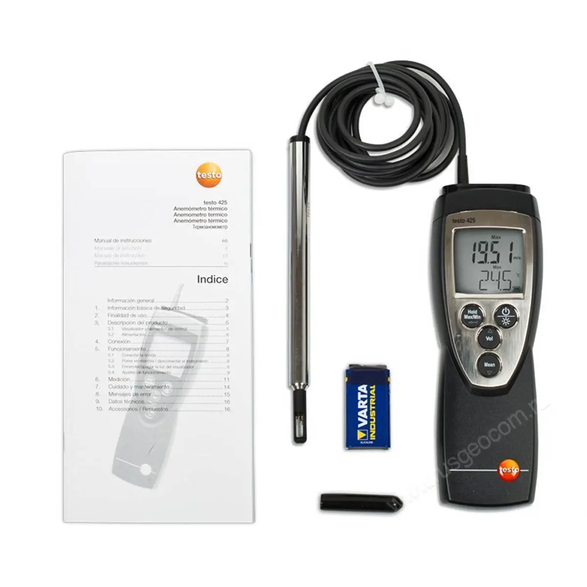 Конструкционно анемометр Testo 425 представляет собой малогабаритный электронный блок с кнопками управления и дисплеем (оснащенным подсветкой), к которому постоянно подключен (с помощью гибкого кабеля) измерительный зонд с обогреваемой струной. Компактность конструкции обеспечивает удобство транспортировки прибора и необременительность его переноски в ходе работ.