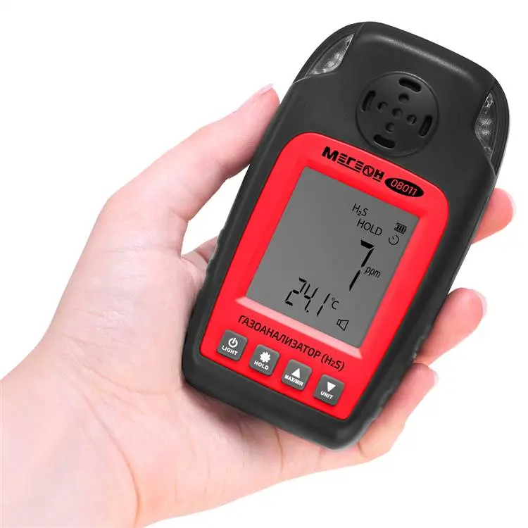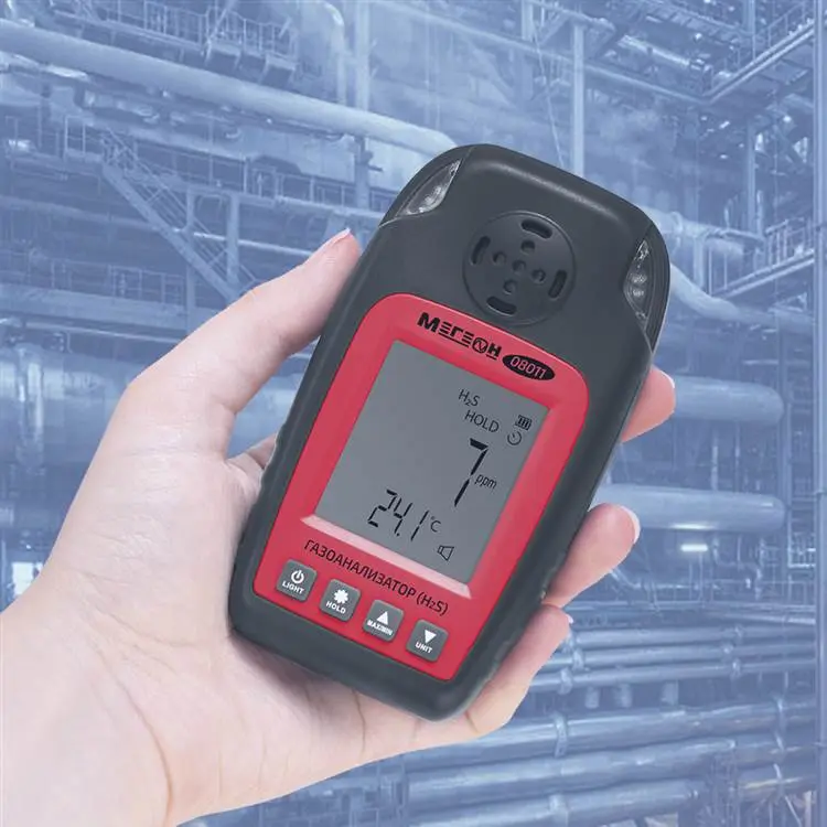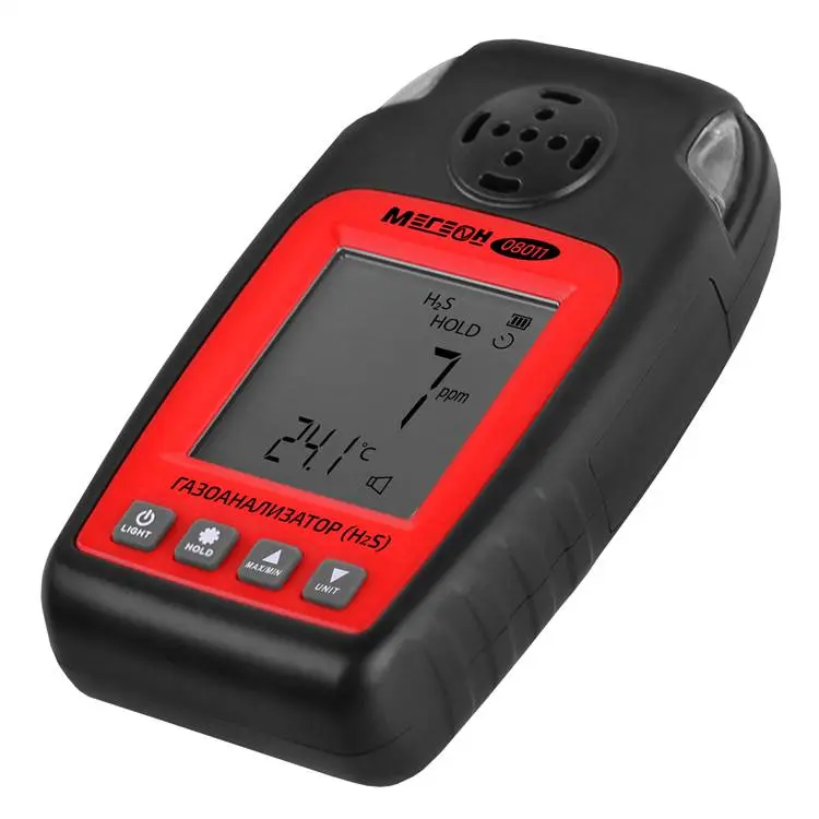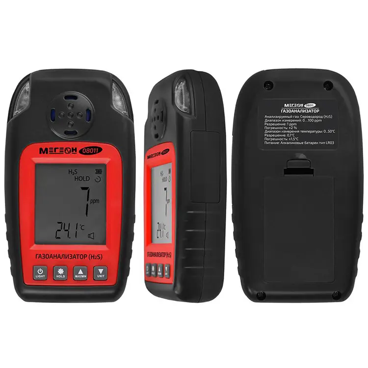 Газоанализатор (измеритель концентрации сероводорода) МЕГЕОН 08011 – портативный цифровой прибор на основе электрохимического сенсора с батарейным питанием, который обеспечивает определение числовых показателей содержания целевого газа в окружающем воздухе, а также реализует функции сигнализатора с двумя настраиваемыми порогами срабатывания, оповещая о превышении предельных уровней с помощью визуальной и акустической индикации. Наличие встроенного термосенсора позволяет дополнительно контролировать температурные параметры воздушной среды. Изделие поставляется в жестком кейсе с мягкими внутренними вставками, который обеспечивает надежную защиту измерителя от механических повреждений в процессе транспортирования и хранения.