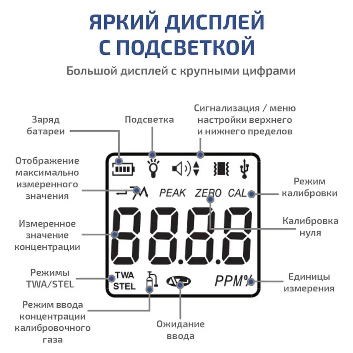 - Фиксация пикового значения — автоматическое сохранение максимальной зафиксированной концентрации