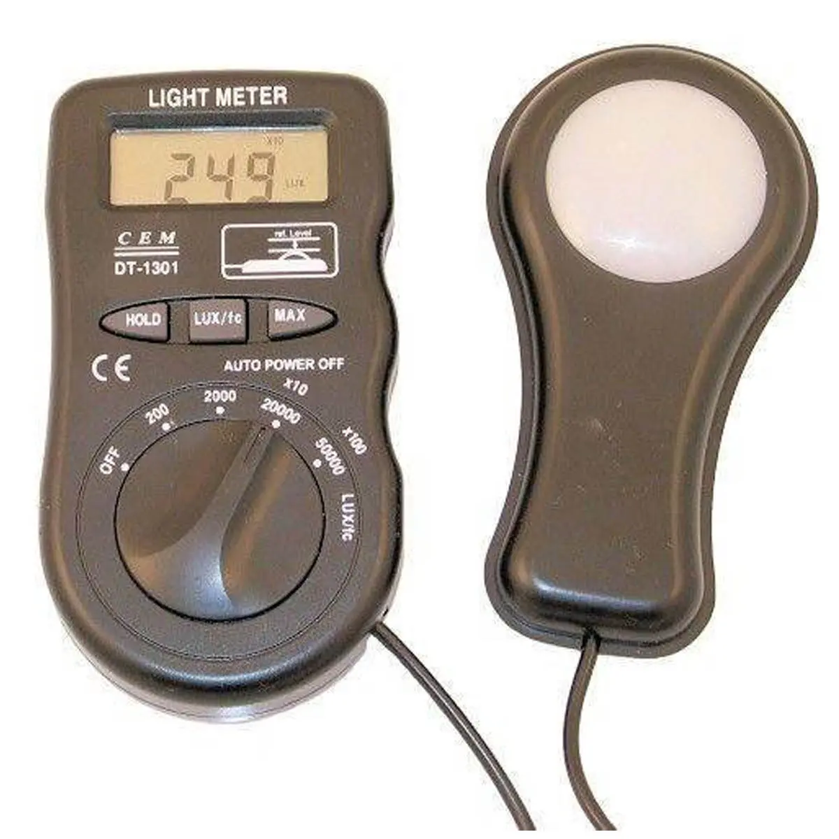 Люксметр DT-1301 имеет очень простое управление – вам нужно лишь выставить фотодетектор в поток света и посмотреть результат на жидкокристаллическом дисплее, оснащенном функцией автоматической подсветки и отображения уровня заряда батареи. Диапазон работы прибора составляет 0-50000 люкс/фут-кандел (1 фут-кандела=10,76 люкс). Имеется режим автоматического выбора диапазона измерений, режим удержания максимального значения и функция автоматического выключения питания через 15 минут бездействия.