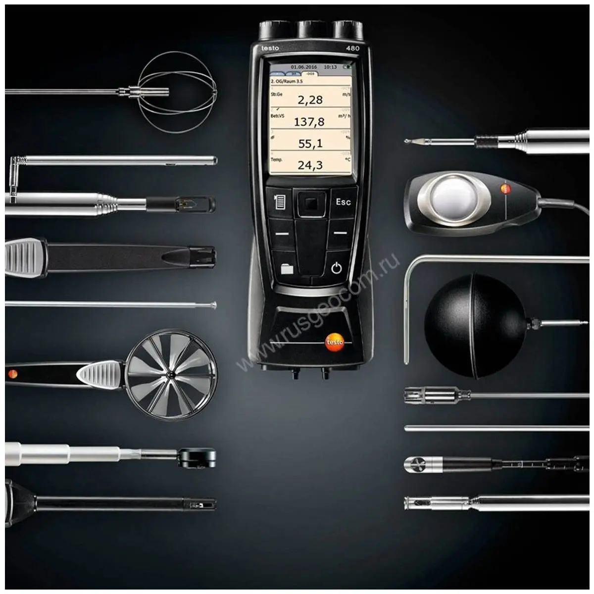 Многофункциональный прибор для настройки систем ОВК, Testo 480 служит для измерений воздушных потоков и определения параметров микроклимата в помещениях. В миниатюрном и очень прочном корпусе прибора оценки качества воздуха объединились такие устройства, как гигрометр, газоанализатор, анемометр, измеритель давления, люксметр и термоанемометр. Главное преимущество Testo 480 состоит в том, что все эти измерения могут выполняться одновременно, что позволяет получить наиболее полную и достоверную картину микроклимата в помещении:
