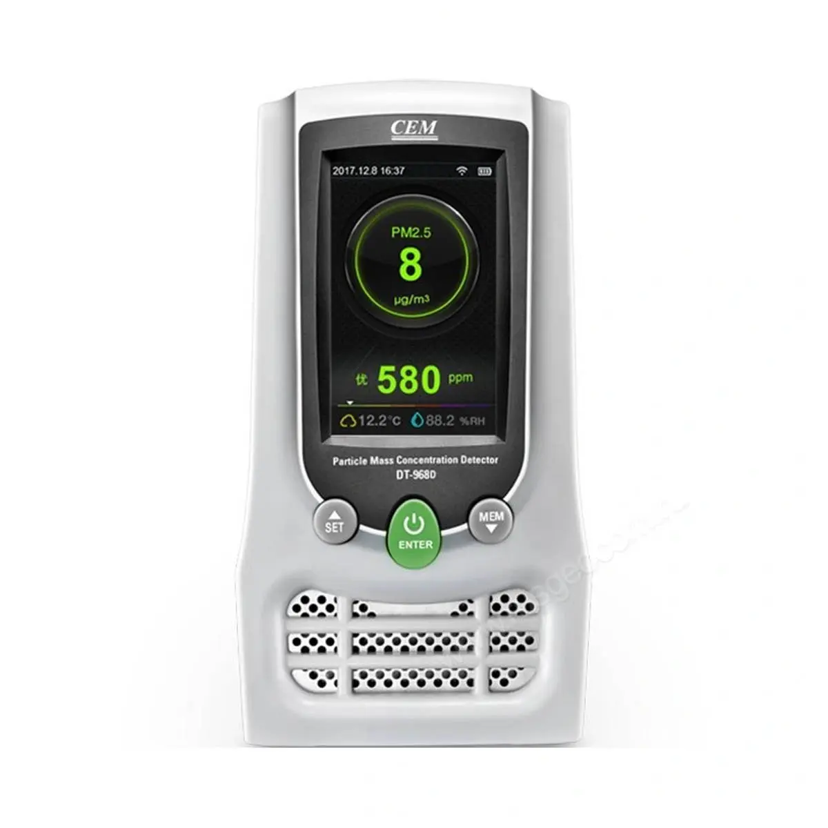 В счетчике пылевых частиц CEM DT-9680 установлен профессиональный сенсор, определяющий концентрацию формальдегида НСНО, а также общее количество летучих ядовитых соединений органического происхождения, в том числе стирола.