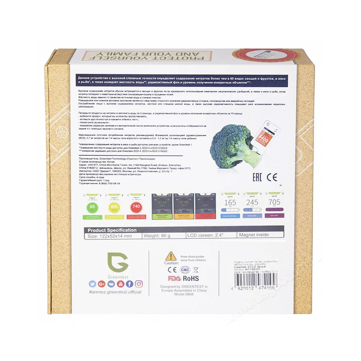 Нитрат-тестер Greentest ECO 6 Gold - новейшая и наиболее универсальная модель производителя, в которой удачно сочетаются функции нитратомера, обнаружения радиации и проверки жесткости воды. Благодаря сенсорному экрану прибором удобно пользоваться, а новая технология тестирования позволяет протестировать безопасность более 60 видов популярных овощей, фруктов, рыбы, мяса и воды.