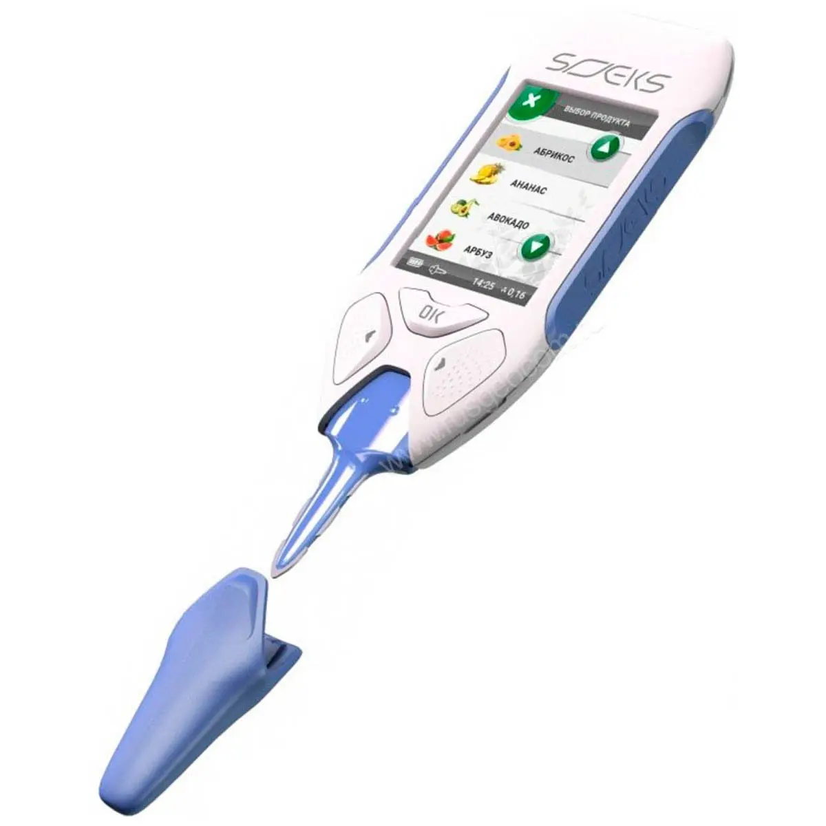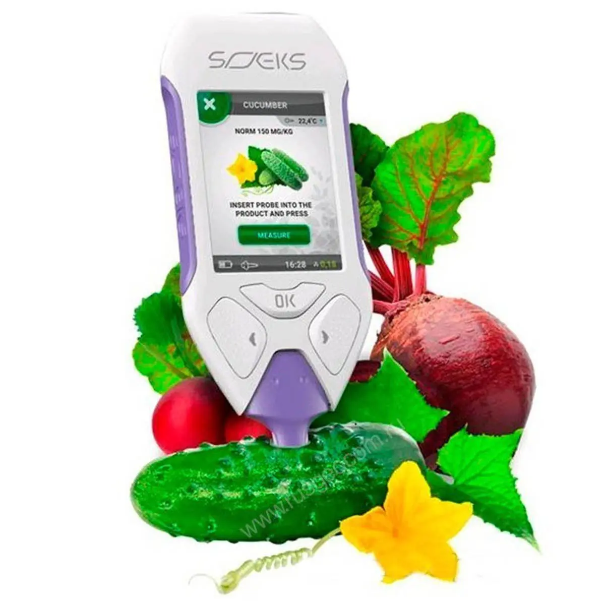 Нитратомер СОЭКС прост в освоении - достаточно выбрать интересующий продукт из списка с названиями и изображениями, ввести зонд и запустить процесс исследования. Числовой результат дополняется цветовой индикацией и пояснениями, благодаря чему для успешного применения модели не требуются специальные знания.