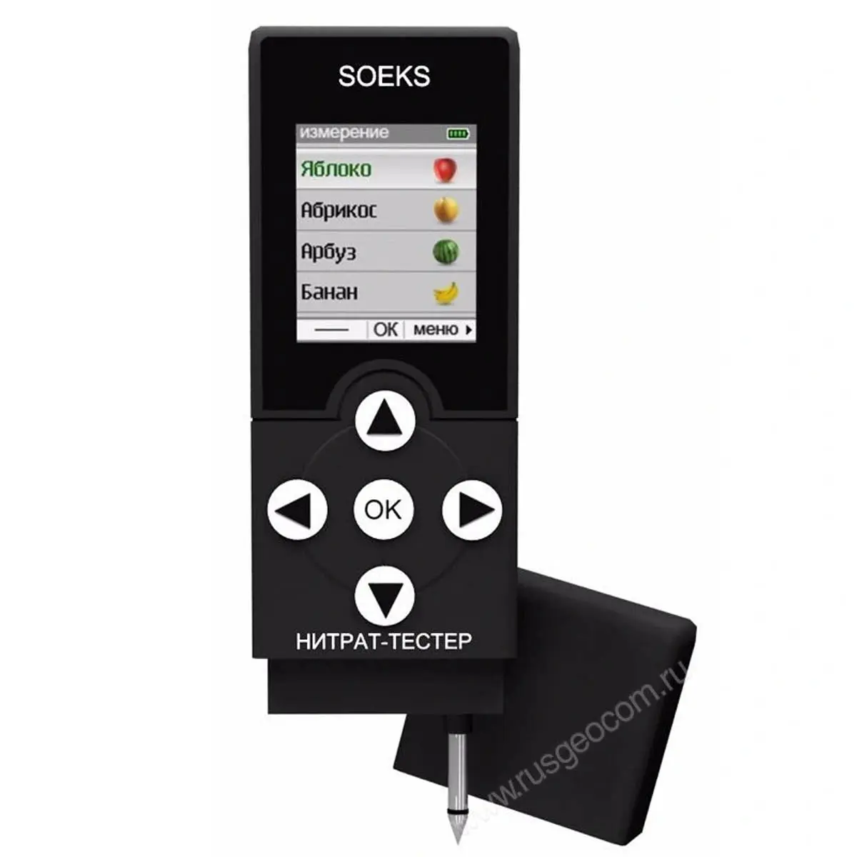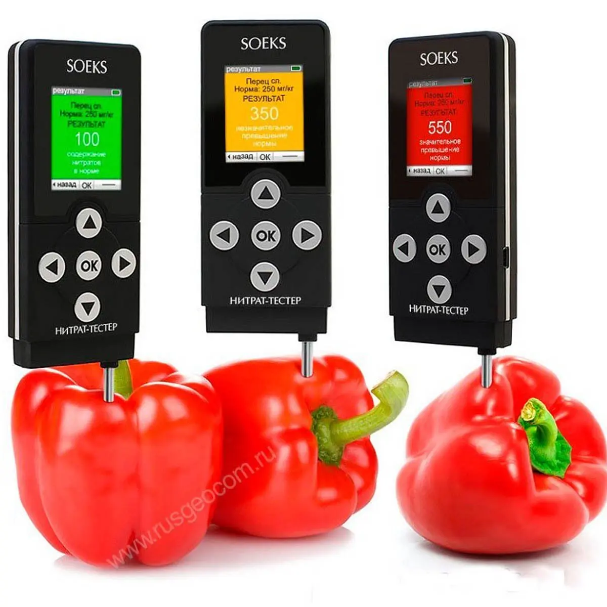 Контрольно-измерительные приборы такого типа просты в освоении - достаточно выбрать интересующий продукт из списка с названиями и изображениями, ввести зонд и запустить процесс исследования. Нитратомер СОЭКС Нитрат-Тестер 2 дополняет числовой результат цветовой индикацией и пояснениями, благодаря чему для его успешного применения не требуются специальные знания.