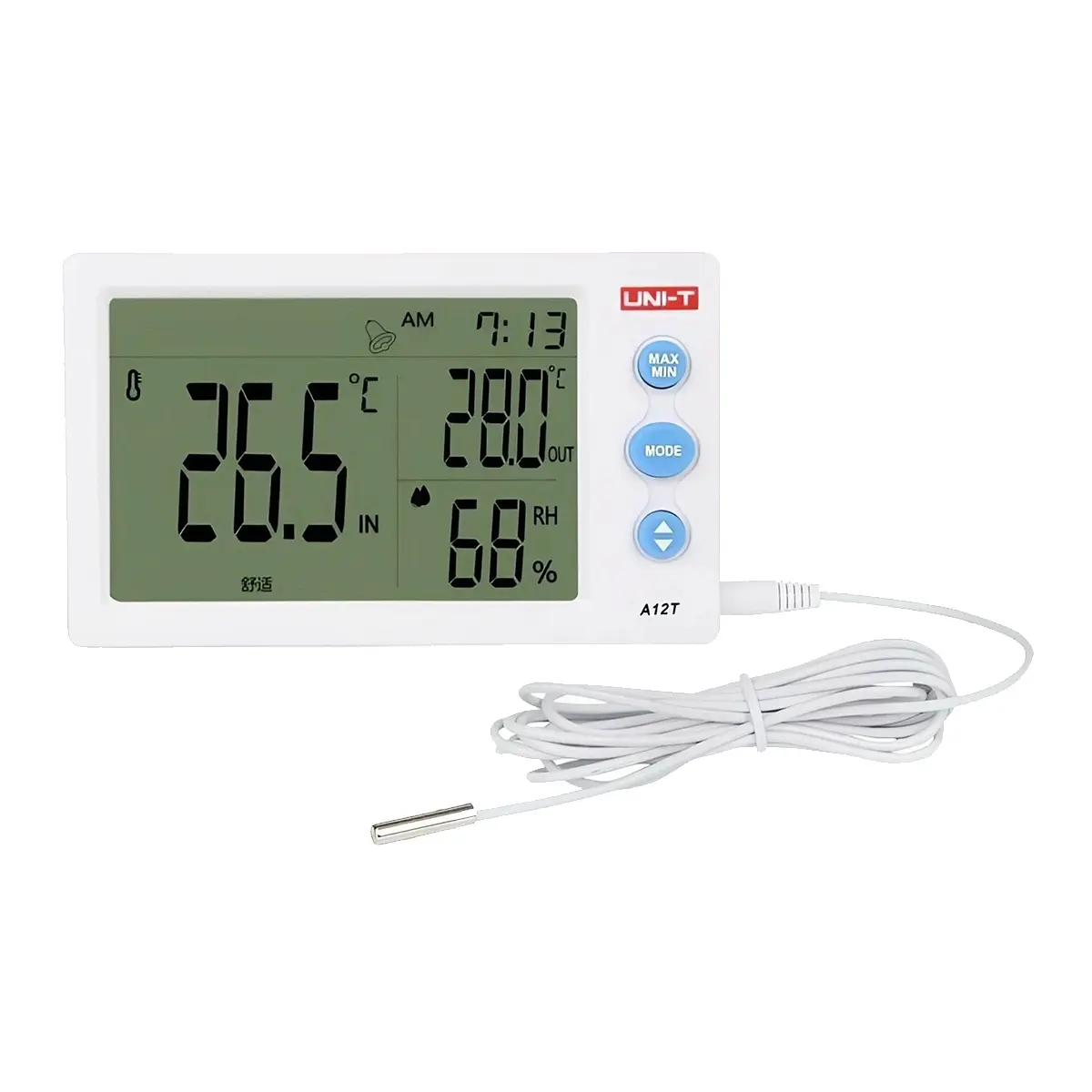 Термогигрометр UNI-T A12T — это компактное устройство для измерения температуры и относительной влажности в помещениях. Он подходит для домашнего использования, офисов, складов и хранилищ, где необходимо контролировать микроклимат. Прибор прост в настройке, не требует сложного обслуживания и обеспечивает стабильные показания при нормальных условиях эксплуатации.