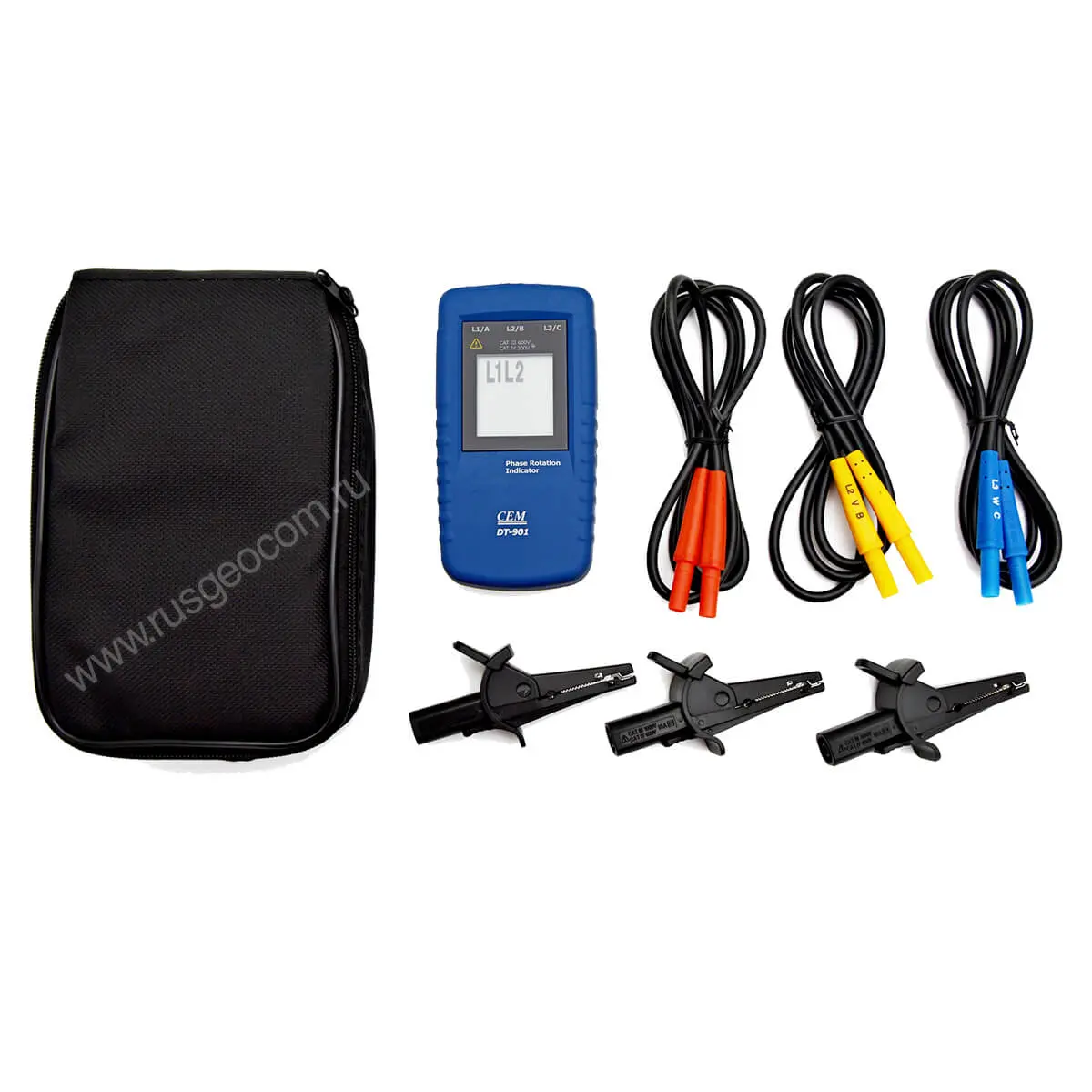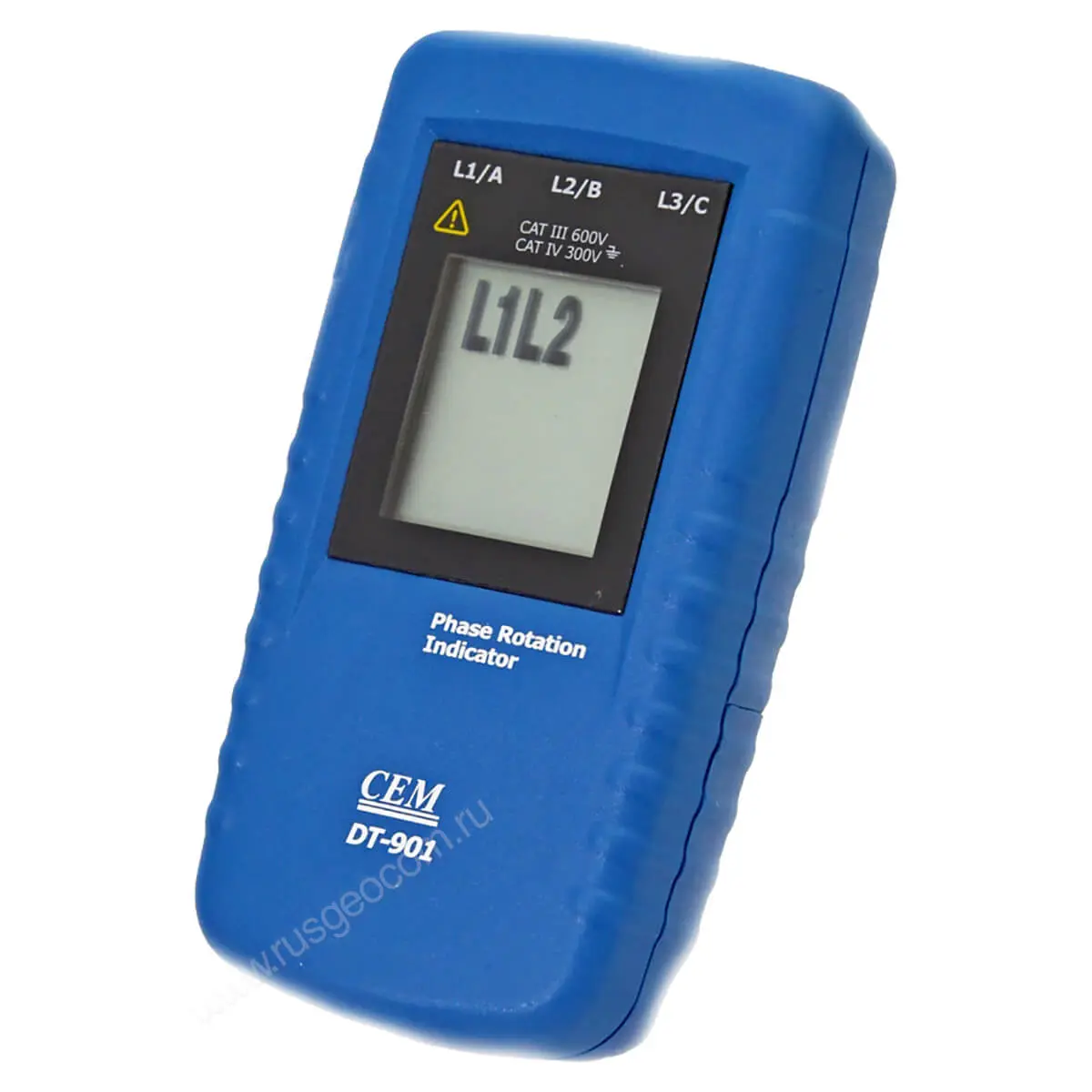 В верхней торцевой части прибора CEM DT-901 помещены три разноцветных проводника с зажимами, соответствующих фазам A (L1) B(L2) C(L3). В комплекте с прибором идёт набор зажимов типа крокодил разных размеров, чтобы облегчить работу с различными типами оборудования. Индикатор чередования фаз CEM DT-901 оснащён жидкокристаллическим дисплеем, на котором отображаются результаты измерений, а также последовательности их чередования (R – прямая, L – обратная). Путем перебора проводников можно определить по индикации на дисплее правильность чередования фаз. Использование ЖК-экрана увеличивает индикационные возможности прибора, позволяя не только оперативно определять чередование фаз, но и исправлять любые неполадки, возникающие в работе указателя.