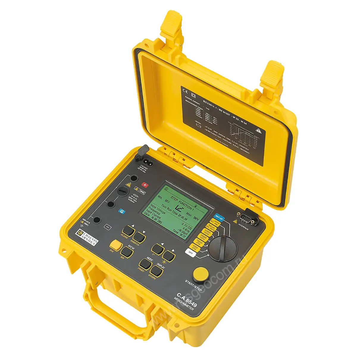 Графический дисплей. Для отображения результатов тестирования в мегаомметре Chauvin Arnoux CA6549 используется графический ЖК дисплей, на который выводится измеряемое значение в цифровой форме. Кроме того, имеется режим построения кривых зависимости сопротивления от времени. Таким образом, можно производить тесты и анализировать результаты без использования стороннего ПО. Дисплей имеет функцию подсветки для работы в темном помещении.