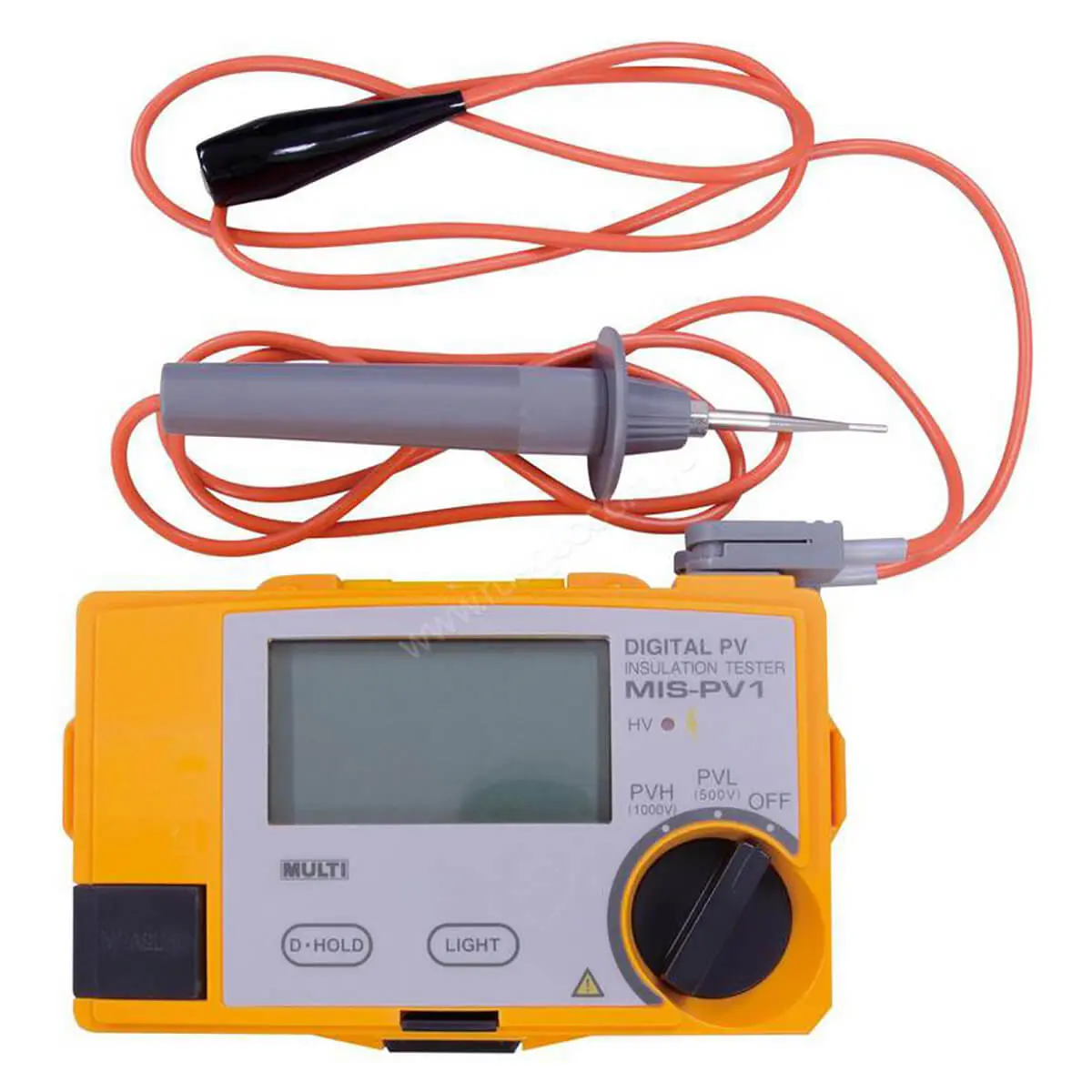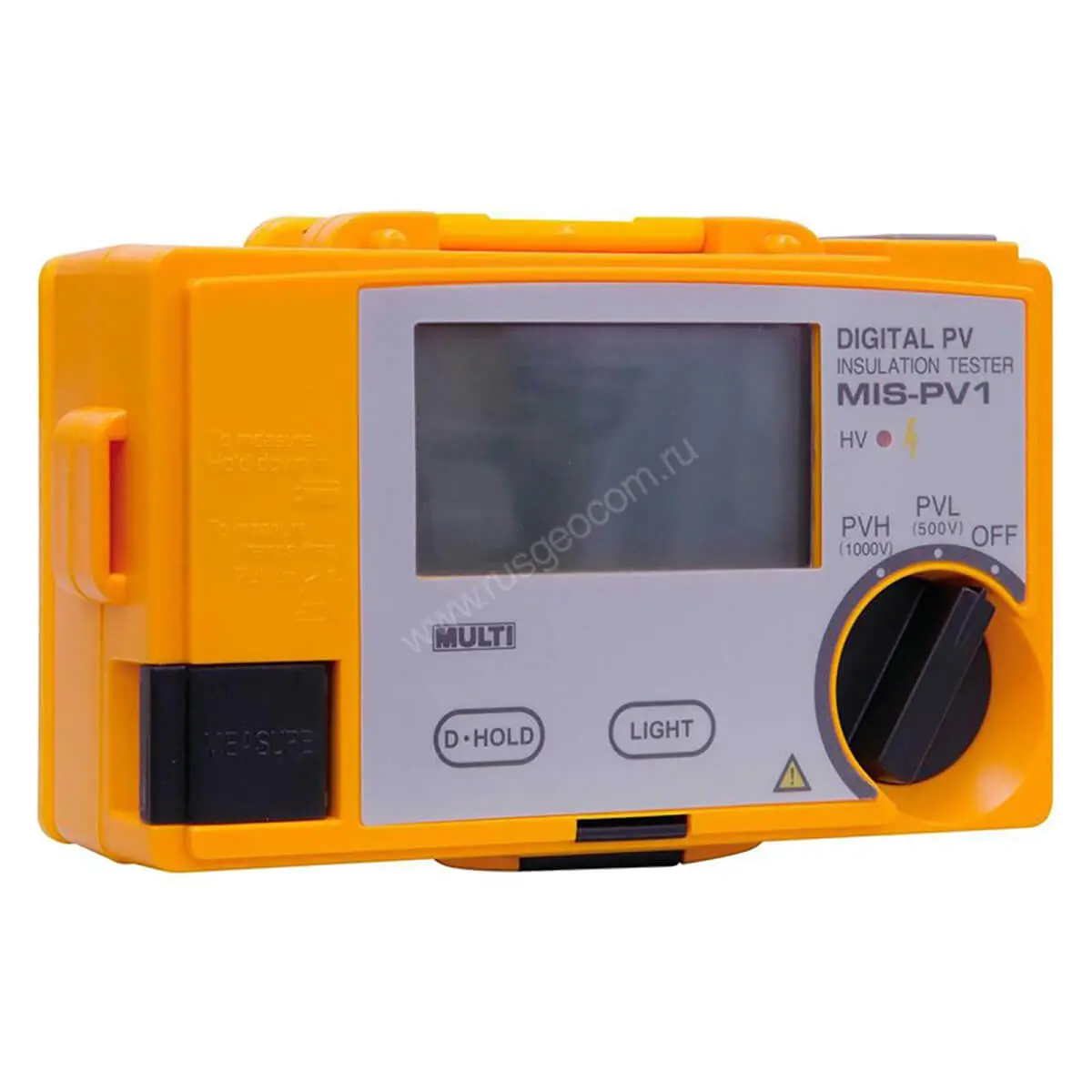 Измеритель сопротивления изоляции для использования в фотогальванических системах. Предел измерения сопротивления изоляции 100 МОм и 2 ГОм непосредственно во время генерации энергии солнечными батареями в линиях до 500 В и до 1000 В соответственно, базовая погрешность ±5 %, максимальное разрешение 1 кОм, ЖК-дисплей с подсветкой (разрешение 3200), удержание показаний, автооткл. через 10 мин., 6 х 1,5 В тип "АА", 170 × 105 × 52 мм, масса 350 г