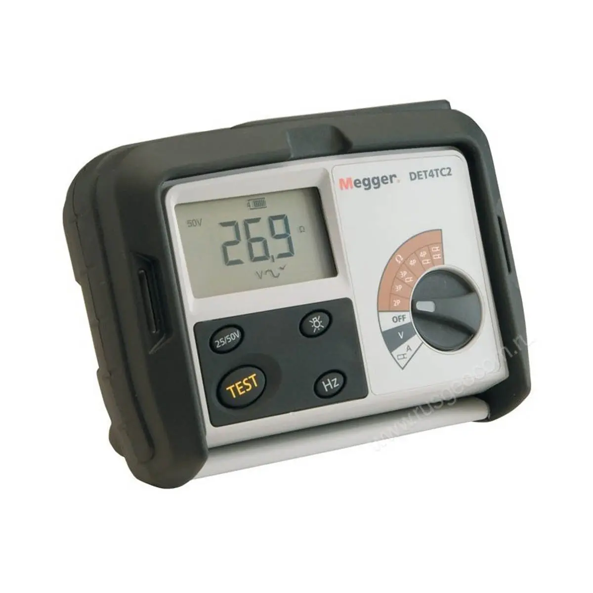 Прибор имеет широкий диапазон измерений от 0.01 до 20 к, измерение фонового напряжения заземления от 1 В до 100 В, а также измерение тока заземления 1 мА до 20 А. Точные результаты могут быть получены в условиях высокого электрического фона, так как прибор имеет возможность фильтрации влияния фоновых напряжений величиной до 40 В пик-пик. Прибор DET4TC2 является цифровым тестером заземления, который работает от 8 батарей типа АА.