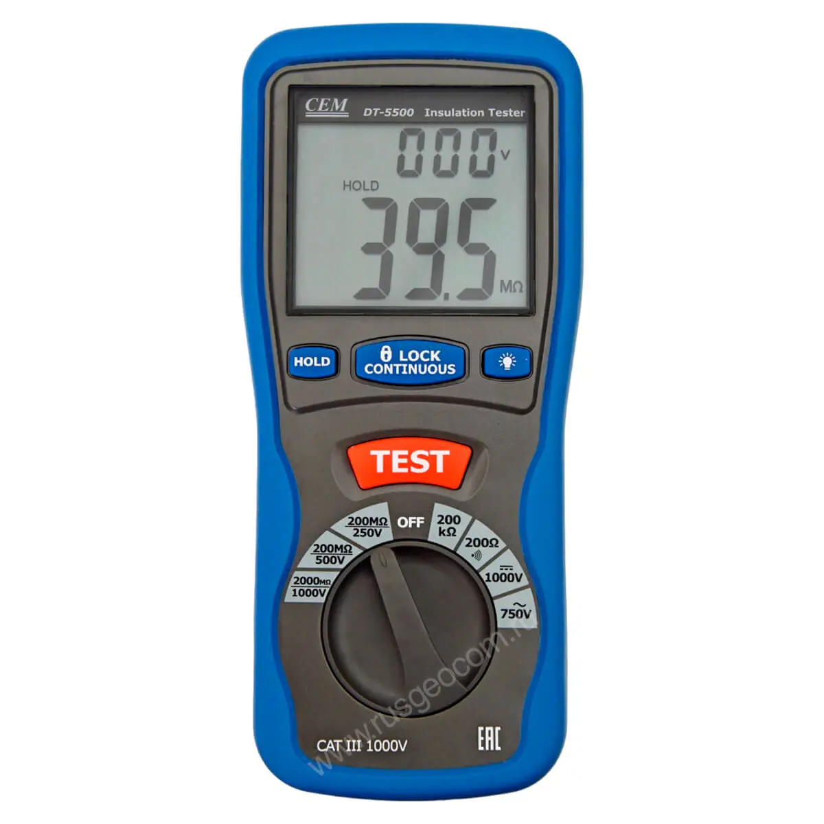 Мегаомметр DT-5500 выполнен в литом корпусе из прочной пластмассы с двойной изоляцией. Функция предупреждения о высоком напряжении предотвратит возможность поражения электрическим током при работе в незнакомых местах. Дополнительные функции установки нуля и удержания результатов измерений на дисплее повышают функциональность этого прибора. Помимо изоляционных свойств проводника измеритель сопротивления DT-5500 способен отображать фактическое напряжение в электрической сети напряжением до 100 В (постоянный ток) и 750 В (переменный ток).