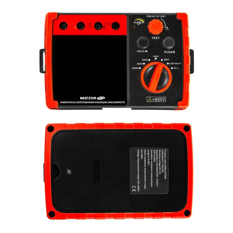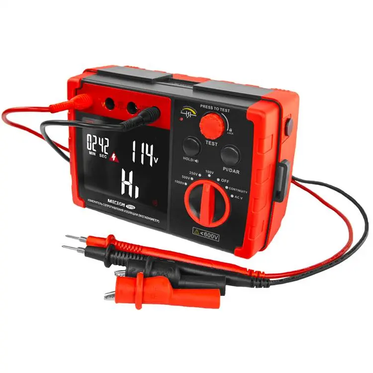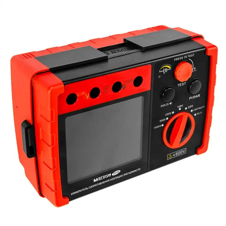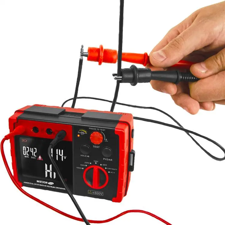 Одной из ключевых функций - определение сопротивления изоляции до 5,5 ГОм. Эта величина позволяет оценить качество изоляции и выявить участки, утратившие свои свойства. Прибор предлагает четыре испытательных режима: 100 В, 250 В, 500 В и 1000 В, что позволяет выбрать оптимальный уровень напряжения в зависимости от конкретных условий измерения.