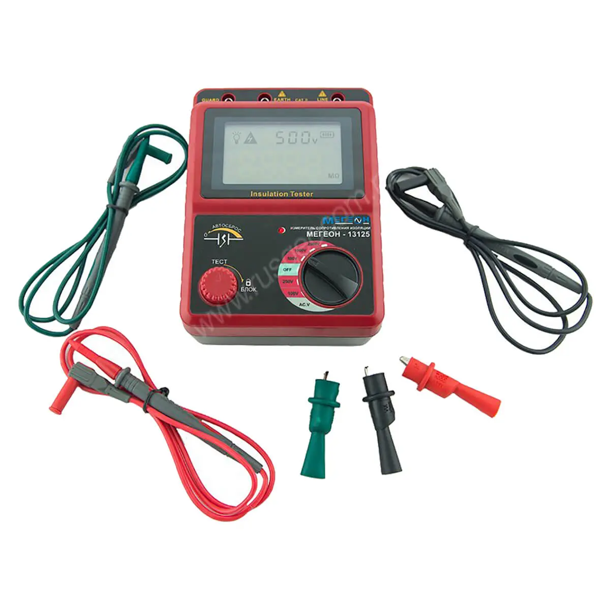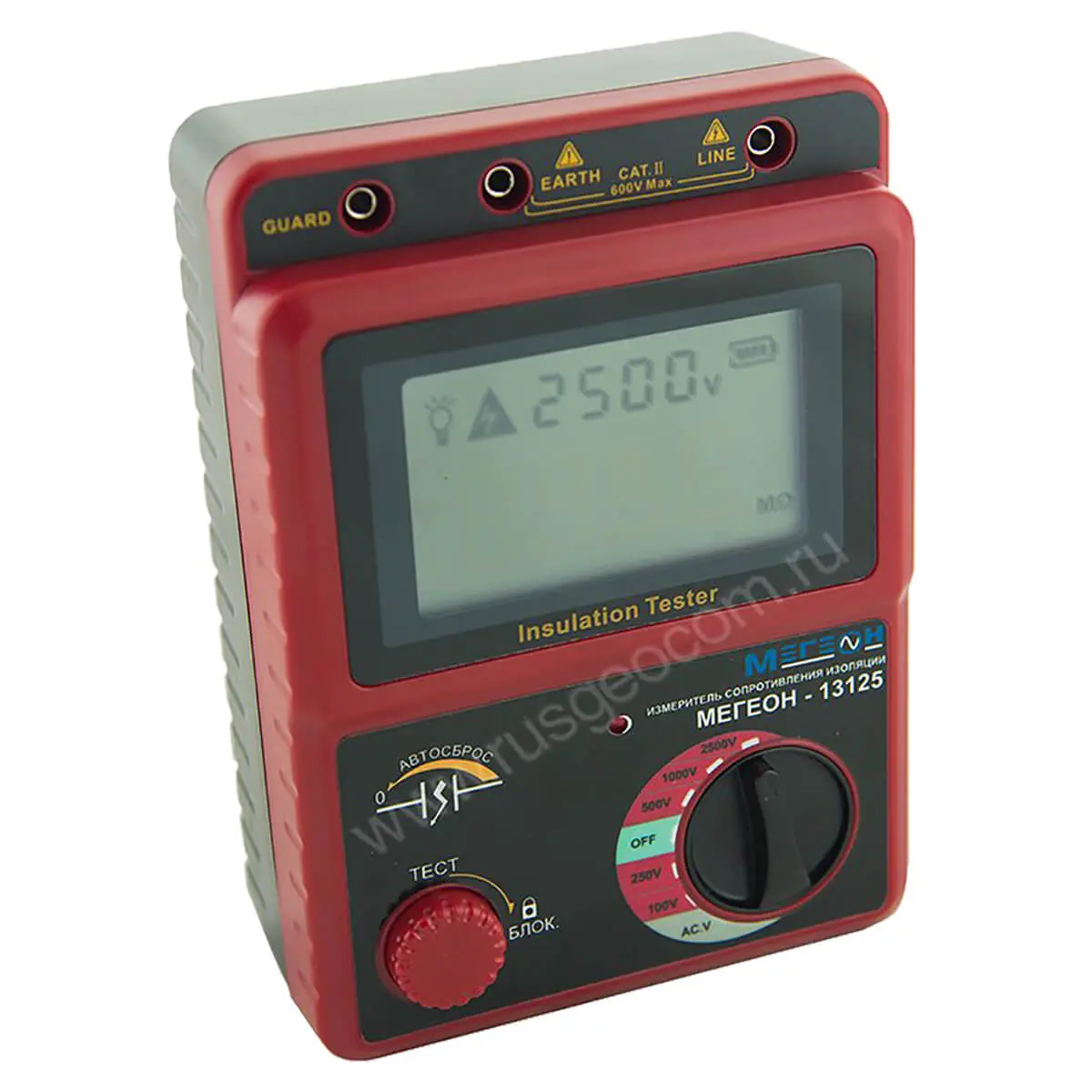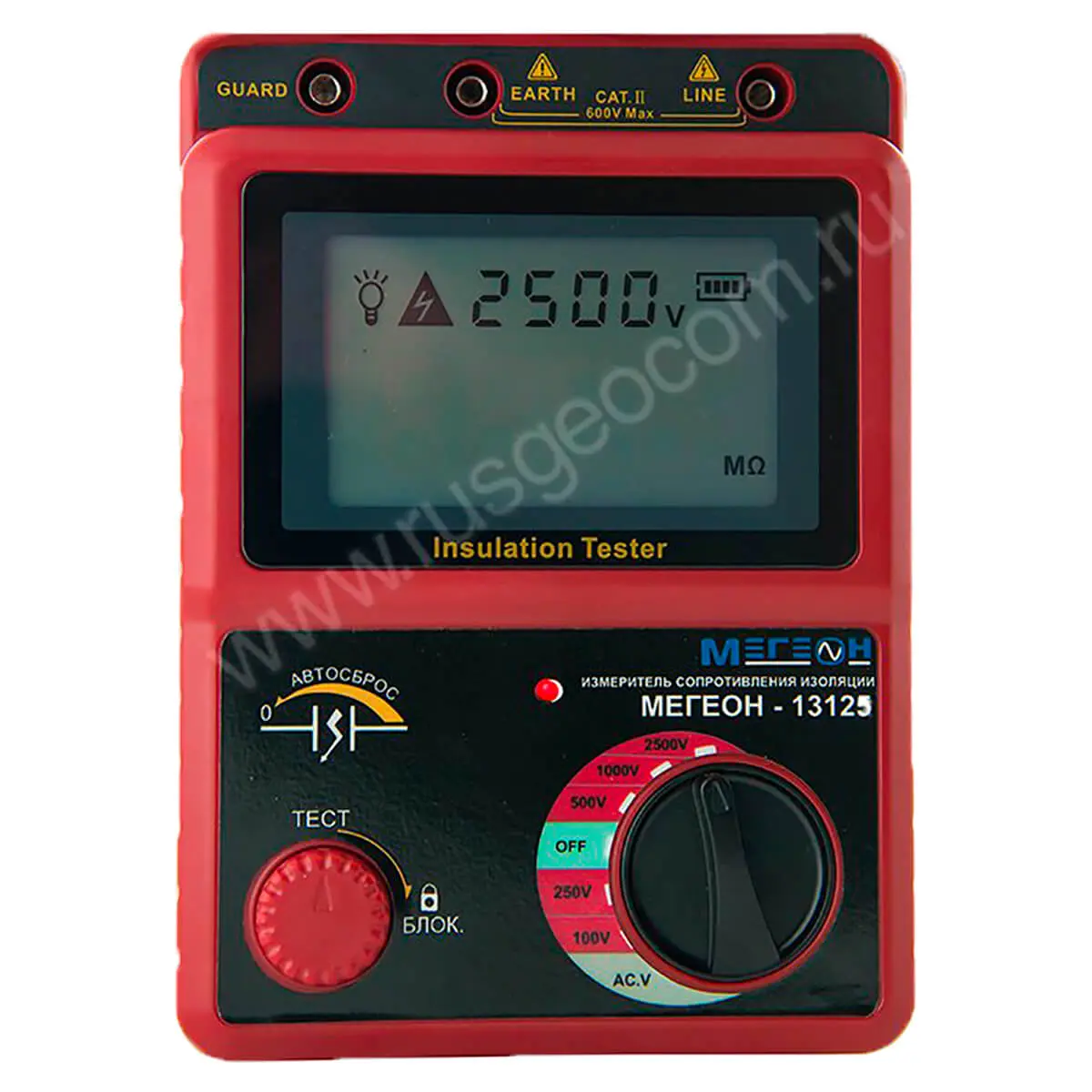 Портативный измерительный прибор Мегеон 13125 является высокоточным измерителем сопротивления изоляции, который позволяет производить измерения сопротивления, используя напряжение высокого значения (до 2500В).