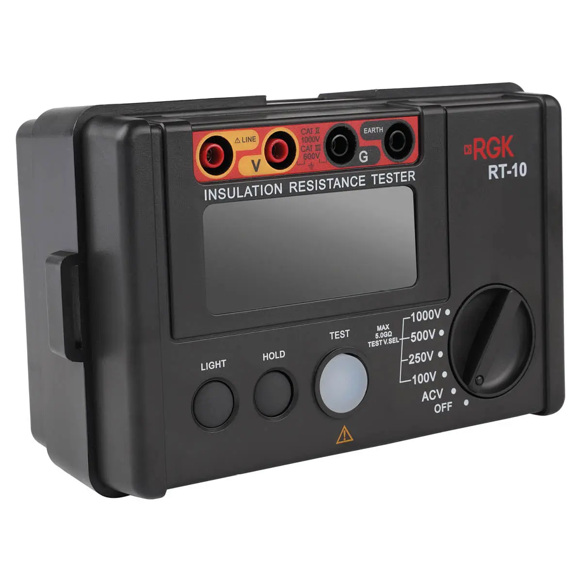 Измеритель сопротивления изоляции RGK RT-10 подает на кабель тестовое напряжение - 100, 250, 500 или 1000 В. Специалист выбирает напряжение в зависимости от расчетного, предположительного значения сопротивления исправного проводника. Так, например, в максимальном режиме можно проводить исследования в диапазоне от 100 МОм до 5 ГОм. По итогу определяется утечка тока и значение сопротивления изоляции между двумя точками.