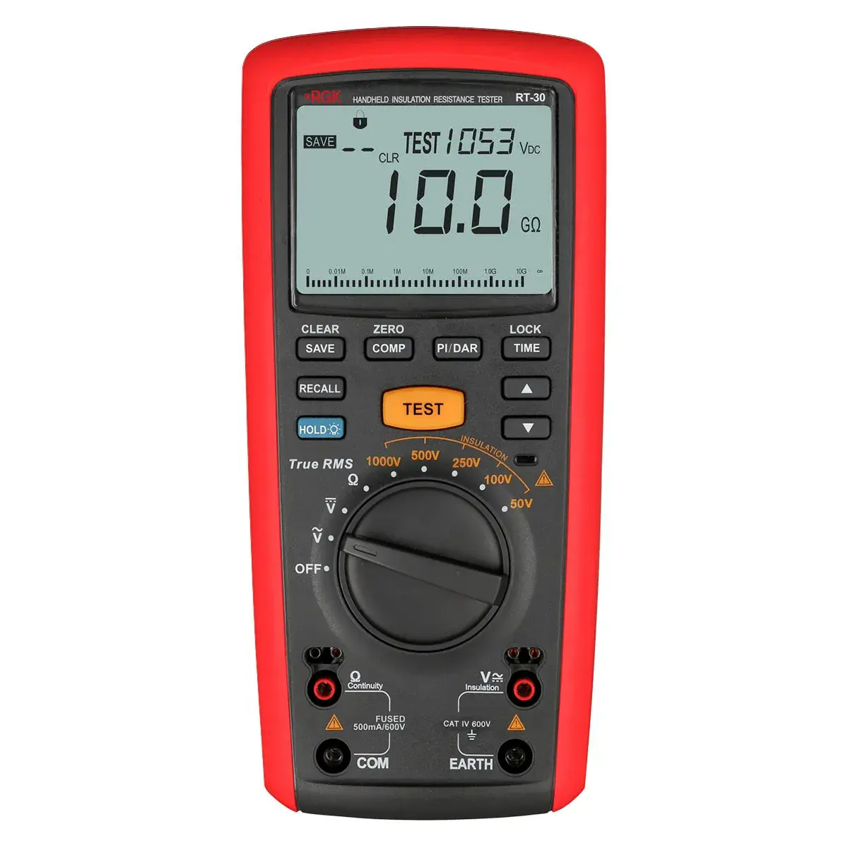 Цифровой мегаомметр RGK RT-30 с поверкой - прибор для электротехников и специалистов по ремонту, который используется для быстрой оценки состояния изоляции силовых кабелей. Чаще всего устройство применяется для техобслуживания промышленного оборудования (электродвигателей, трансформаторов) и сетей, в сервисных центрах по ремонту электроники и при работе с электрическими системами обогрева пола.