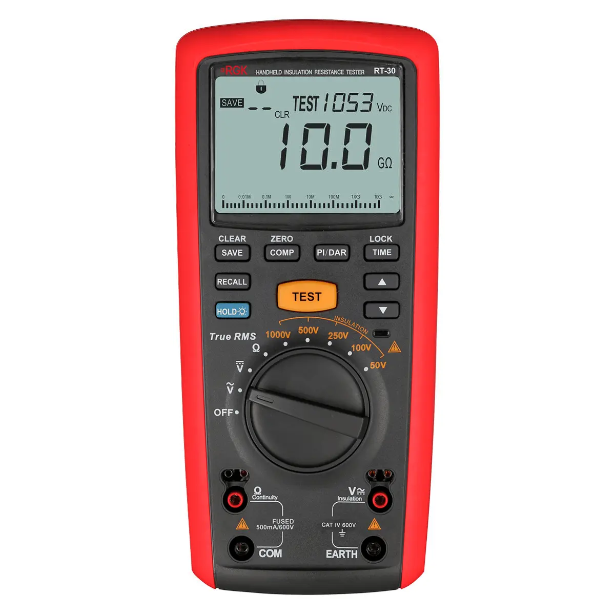 Цифровой мегаомметр RGK RT-30 - прибор для электротехников и специалистов по ремонту, который используется для быстрой оценки состояния изоляции силовых кабелей. Чаще всего устройство применяется для техобслуживания промышленного оборудования (электродвигателей, трансформаторов) и сетей, в сервисных центрах по ремонту электроники и при работе с электрическими системами обогрева пола.