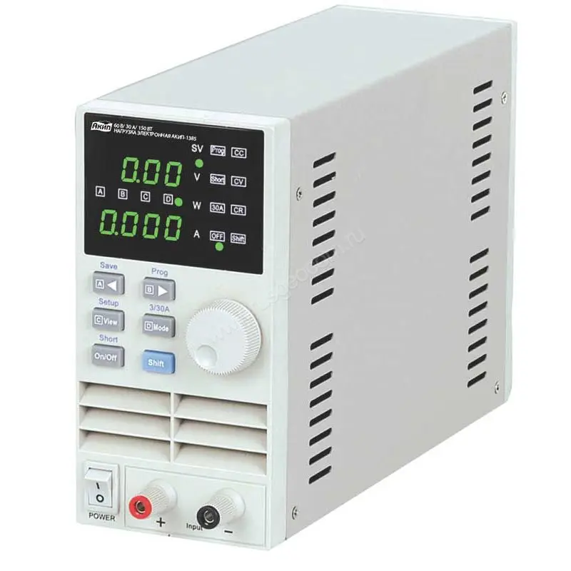 Программируемая электронная нагрузка постоянного тока. Ток до 30 А, напряжение до 60 В, мощность до 150 Вт, режимы работы: постоянный ток (СС), постоянное напряжение (CV), постоянное сопротивление (CR); светодиодный дисплей; дискр. уст. параметров (набор на клавиатуре или в пошаговом режиме); режимы защиты: от перегрузки по току (ОСР), перенапряжения (OVP), по мощности (OPP); внутренняя память 160 ячеек (профили состояний), пошаговое программирование: 100 шагов с длительностью 0,4 с...25 с, масса 3,5 кг, 88 х 175 х 282 мм.
