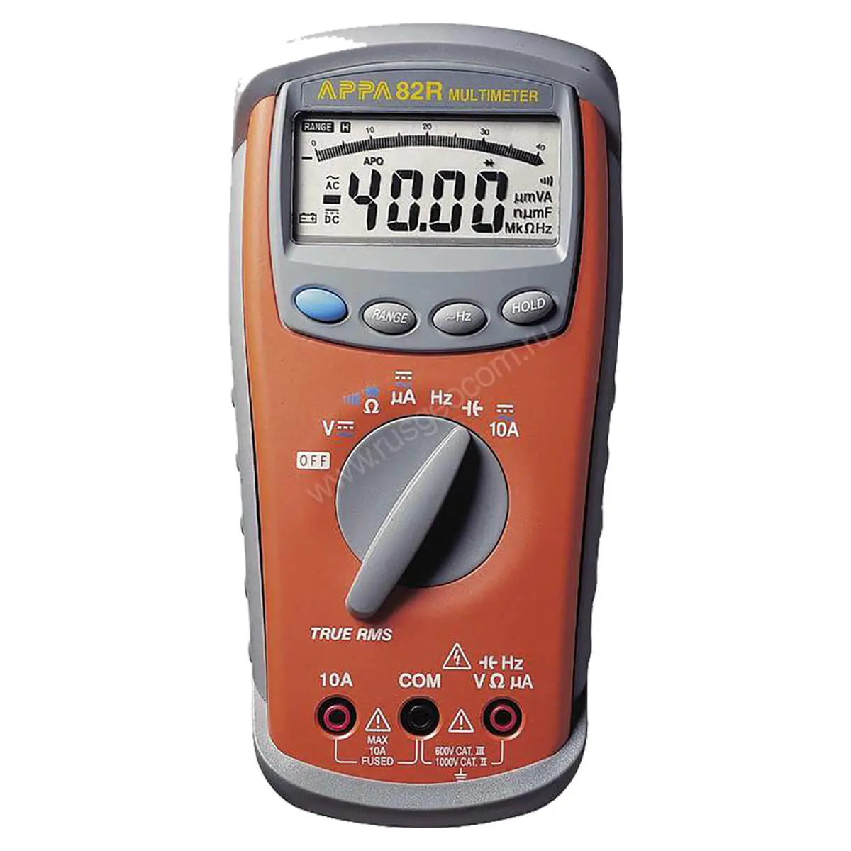 По сравнению с базовой моделью серии, мультиметр APPA 82R отличается расширенной функциональностью и улучшенной наглядностью. К режимам контроля напряжения, силы тока и сопротивления, с проверкой полупроводников и прозвонкой электрических цепей, добавлены функции измерения частоты и емкости. Также в увеличен предел отображения цифрового индикатора и повышено количество сегментов аналоговой гистограммы. При измерениях можно быстро проверить частоту сигнала, не меняя положения центрального переключателя – путем нажатия кнопки "~Hz".