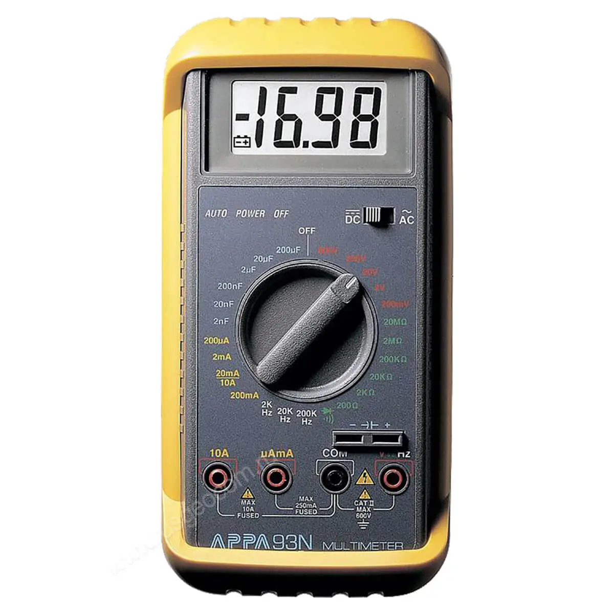 Устройство имеет автономное питание и работает от батареи 9В типа "Крона", рассчитанной на 300 часов. APPA 93N имеет ударопрочный корпус с влагозащитным слоем. Компания — производитель поставляет мультиметр вместе с 2-мя измерительными щупами, батареей, специальным кожухом с креплениями, зажимом "крокодил".