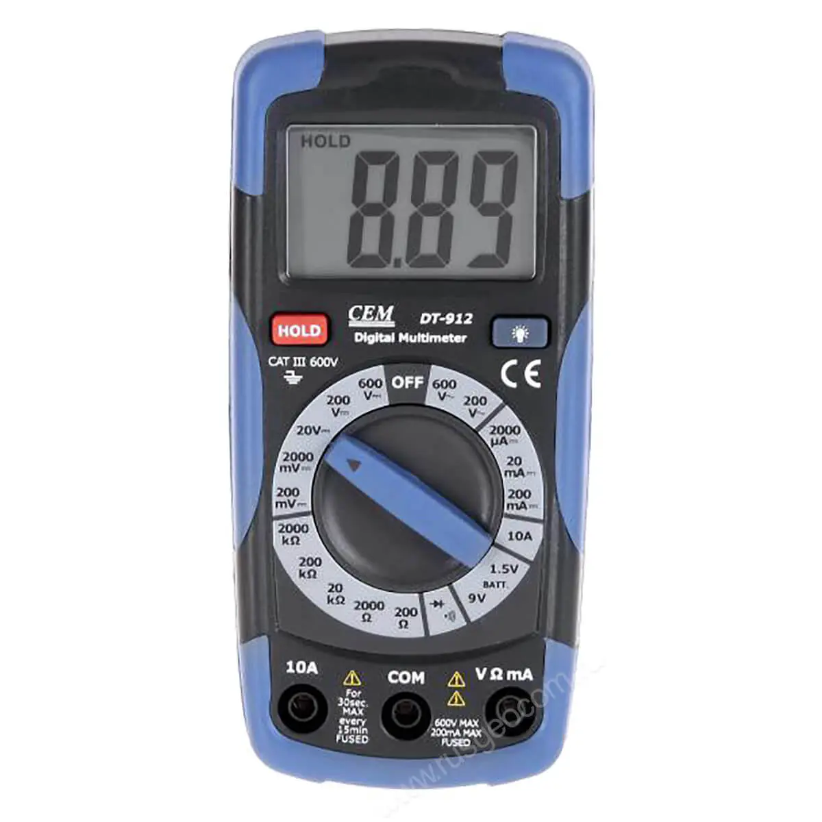 Подсветка дисплея и функция HOLD, фиксирующая текущие показания цифрового индикатора, обеспечивают удобство считывания данных в любых условиях. Для большего удобства работы мультиметр CEM DT-912 оснащен откидной ножкой, с помощью которой вы можете разместить прибор на любой горизонтальной поверхности в положении, удобном для снятия показаний. Купить CEM DT-912 можно для комфортной повседневной работы с бытовыми и промышленными электроцепями.
