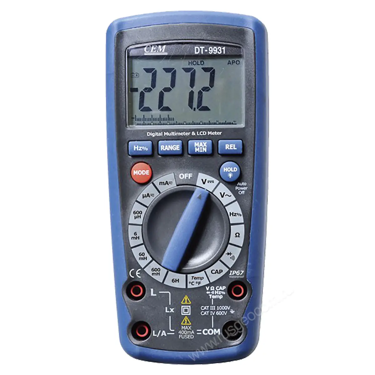 Корпус DT-9931 выполнен из прочного пластика и имеет влагозащитное покрытие. Корпус герметичен и надежно защищает внутренние элементы мультиметра от попадания влаги даже при погружении прибора в воду. Для удобства в работе DT-9931 оснащен встроенной настольной подставкой. Аппарат имеет автономное питание и работает от батареи 9В типа "Крона". Для экономного расхода заряда аккумулятора мультиметр имеет функцию автоматического отключения. Она срабатывает через 30 минут бездействия.