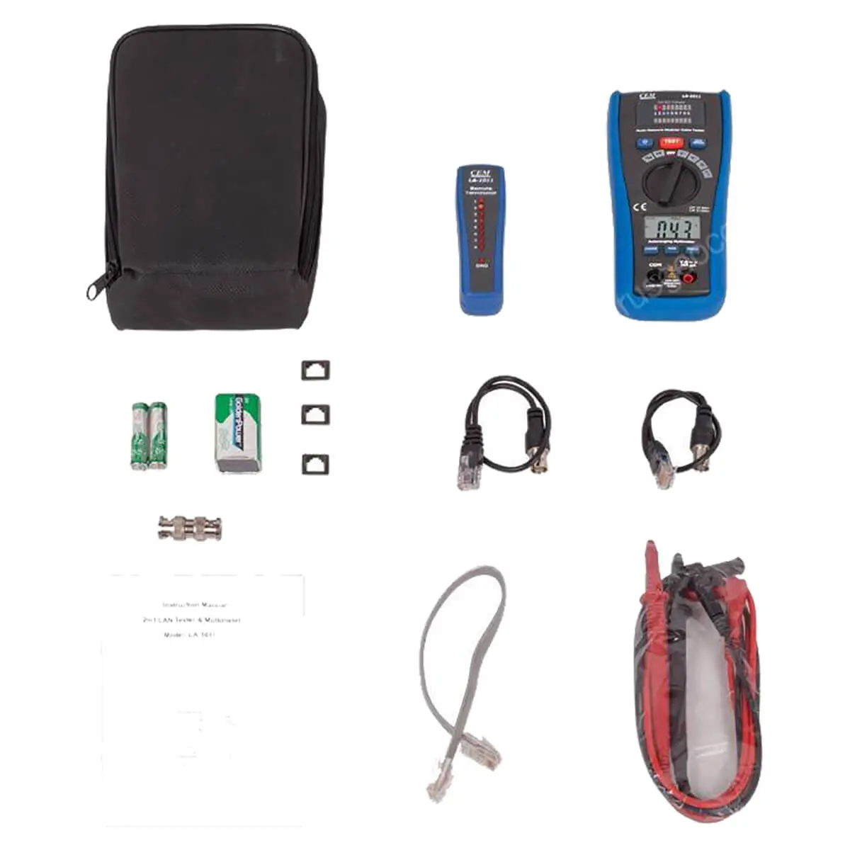 В состав комплекта тестера LAN CEM LA-1011 входят блок управления и индикации, и дополнительный выносной приёмник сигнала, благодаря чему вы можете тестировать не только сетевые кабели перед их прокладкой, но и уже смонтированные линии, устанавливая дополнительный приёмник на удаленном конце. Сам блок управления объединяет в себе мультиметр, а также передатчик и приемник LAN-тестера.