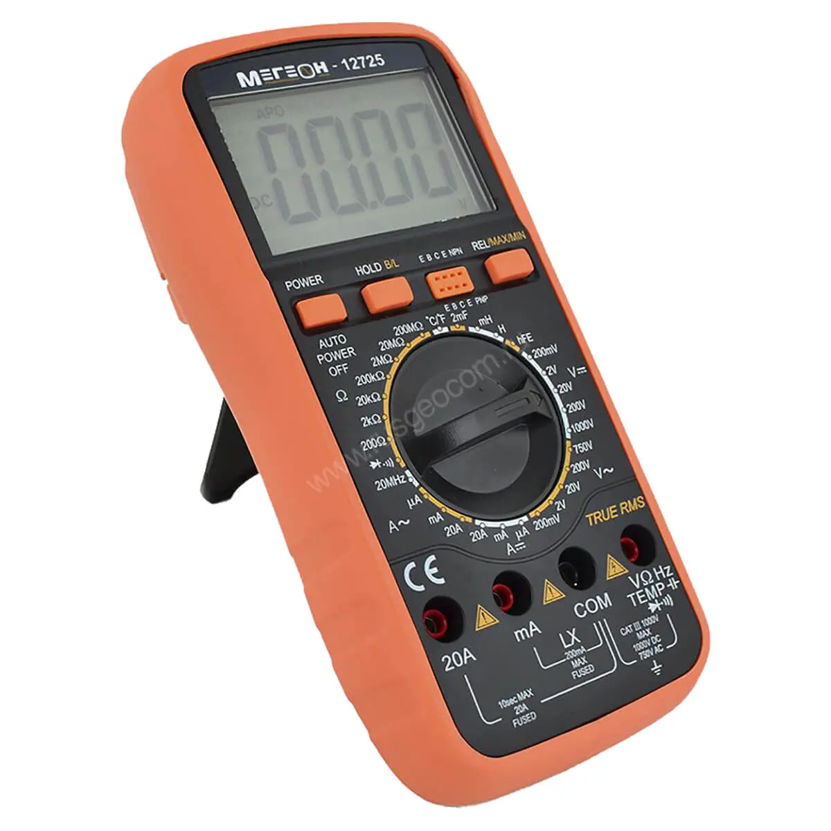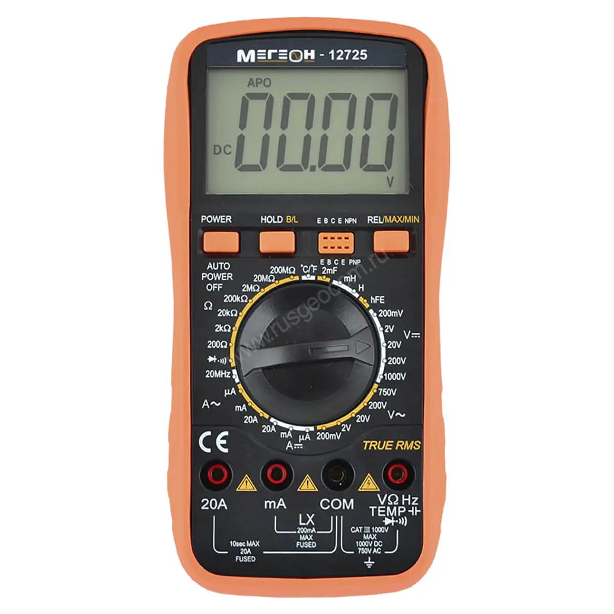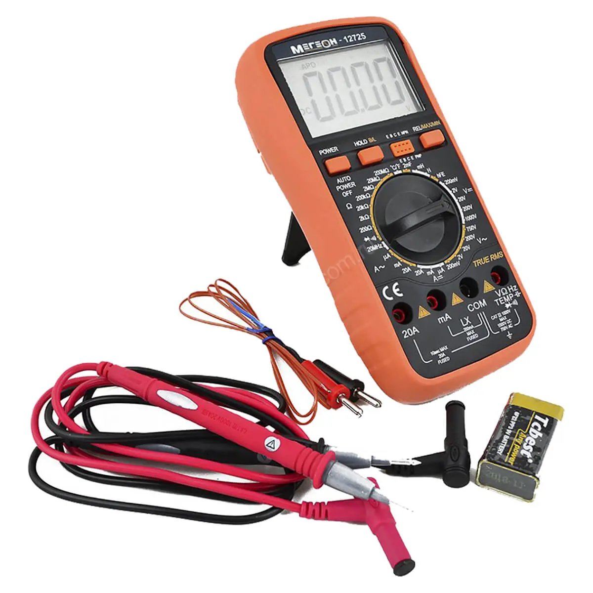 Надежный и высокоэффективный цифровой мультиметр МЕГЕОН 12725 (TrueRMS) предназначен для измерения переменного (True RMS) и постоянного напряжения, переменного (True RMS) и постоянного тока, сопротивления, емкости конденсаторов, индуктивности, частоты, температуры (шкала Цельсия/Фаренгейта), проверки диодов, проверки транзисторов и прозвонки соединений. Для улучшения считывания показаний в приборе применен жидкокристаллический дисплей 3½ разряда, с высотой цифр 42 мм. Мультиметр МЕГЕОН 12725 имеет защиту от перегрузки на всех режимах, функцию автоматического выключения питания и эргономичный корпус с защитным чехлом, который делает эксплуатацию прибора более удобной. В основу прибора положена БИС АЦП с двойным интегрированием. Этот превосходный измерительный прибор идеально подходит для лаборатории, производства и домашнего хозяйства.