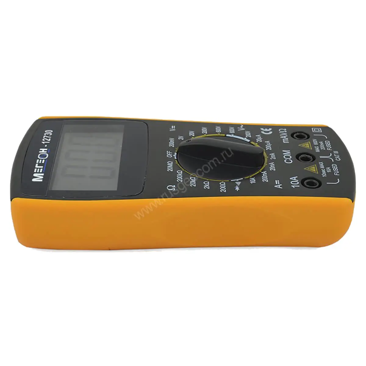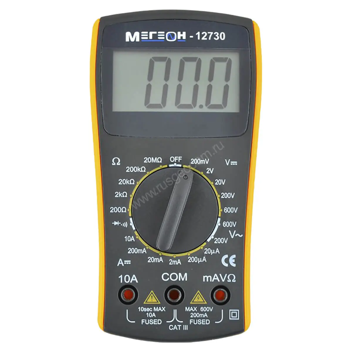 Мультиметр МЕГЕОН 12730 – карманный переносной измерительный прибор, который предназначен для измерения постоянного и переменного тока, постоянного напряжения, сопротивления, а также проверки диодов и целостности цепи. Для улучшения чтения показаний прибор оснащен ЖК дисплеем с символами высотой в 22мм. Максимальное индицируемое число 1999 (31/2) с указанием полярности. Цифровой мультиметр МЕГЕОН 12730 на задней панели имеет откидную подставку-упор для установки на рабочем месте с целью удобства считывания показаний. Мультиметр МЕГЕОН 12730 оптимальный прибор начального уровня для лабораторий, эксплуатации электрооборудования, для бытового применения и хобби.