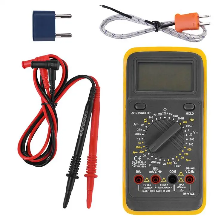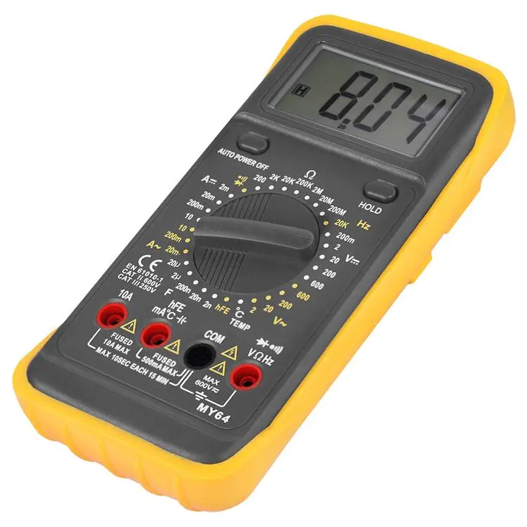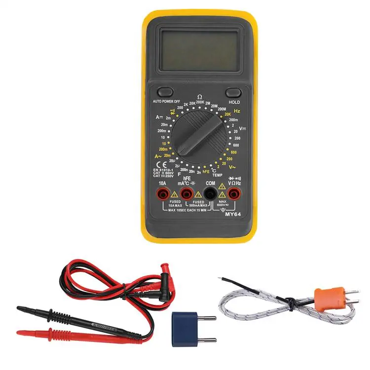 Мультиметр МЕГЕОН MY64 – профессиональный цифровой прибор бюджетного класса с ручным выбором пределов измерений и батарейным питанием. Он обладает широким измерительным диапазоном, благодаря чему может использоваться для диагностики и настройки как силового оборудования с рабочим напряжением до 600 В, так и радиотехнических устройств, бытовых приборов и т.п. Изделие служит для определения основных электрических параметров и дополнительно комплектуется подключаемым датчиком-термопарой для выполнения температурных измерений в диапазоне от –20 до +1000°C.