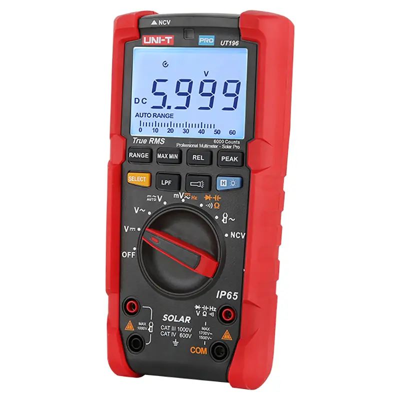 UNI-T UT196 — это специализированный цифровой мультиметр, разработанный специально для обслуживания солнечных электростанций, ветрогенераторов и других систем с повышенным напряжением. Его главное отличие от стандартных моделей — способность измерять постоянное напряжение до 1700 В и переменное до 1500 В, что выходит далеко за рамки возможностей обычных приборов и соответствует требованиям современных фотоэлектрических установок.