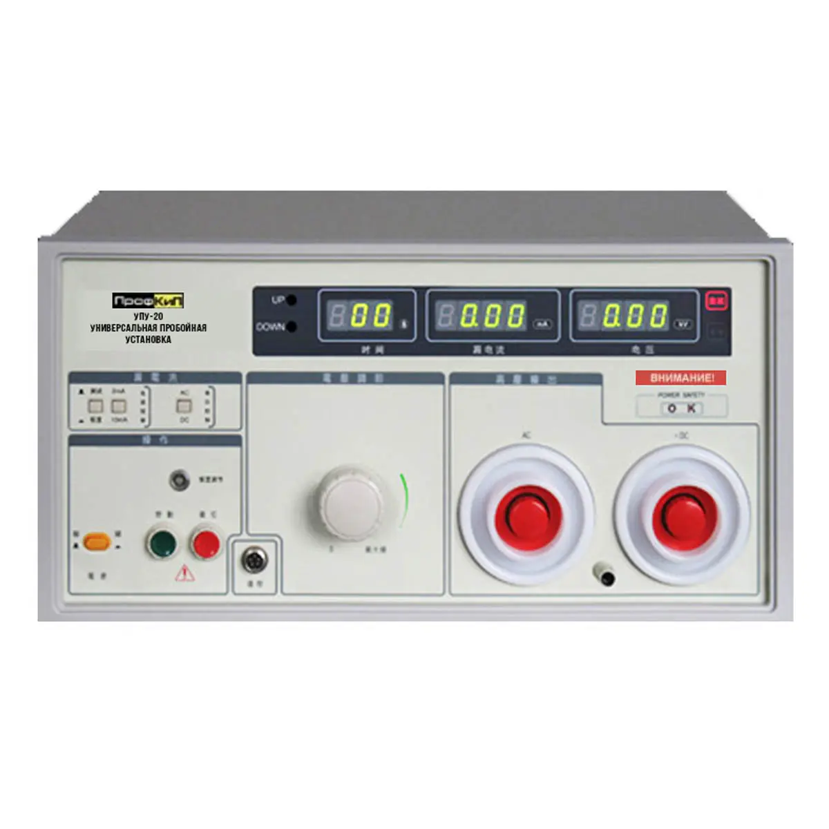 Высоковольтная пробойная установка ПрофКиП УПУ20 предназначена для генерирования напряжения постоянного и переменного тока синусоидальной формы, для проведения испытаний на проверку напряжения пробоя, измерения тока утечки и других показателей эффективности электрической безопасности изоляции силовых кабелей, электроустановок, диэлектриков, средств защиты и т.д. Так же универсальная пробойная установка ПрофКиП УПУ20 может выступать в качестве источника питания высокого напряжения постоянного тока, для проверки характеристик компонентов и приборов.