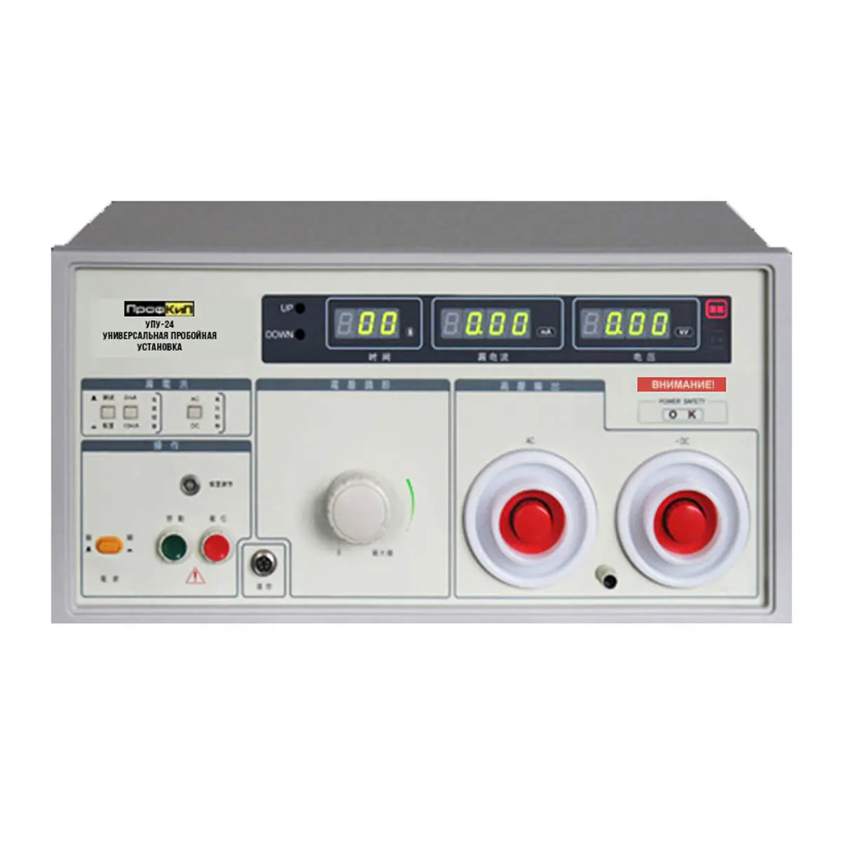 Высоковольтная пробойная установка ПрофКиП УПУ24 предназначена для генерирования напряжения постоянного и переменного тока синусоидальной формы, для проведения испытаний на проверку напряжения пробоя, измерения тока утечки и других показателей эффективности электрической безопасности изоляции силовых кабелей, электроустановок, диэлектриков, средств защиты и т.д. Так же универсальная пробойная установка ПрофКиП УПУ24 может выступать в качестве источника питания высокого напряжения постоянного тока, для проверки характеристик компонентов и приборов.