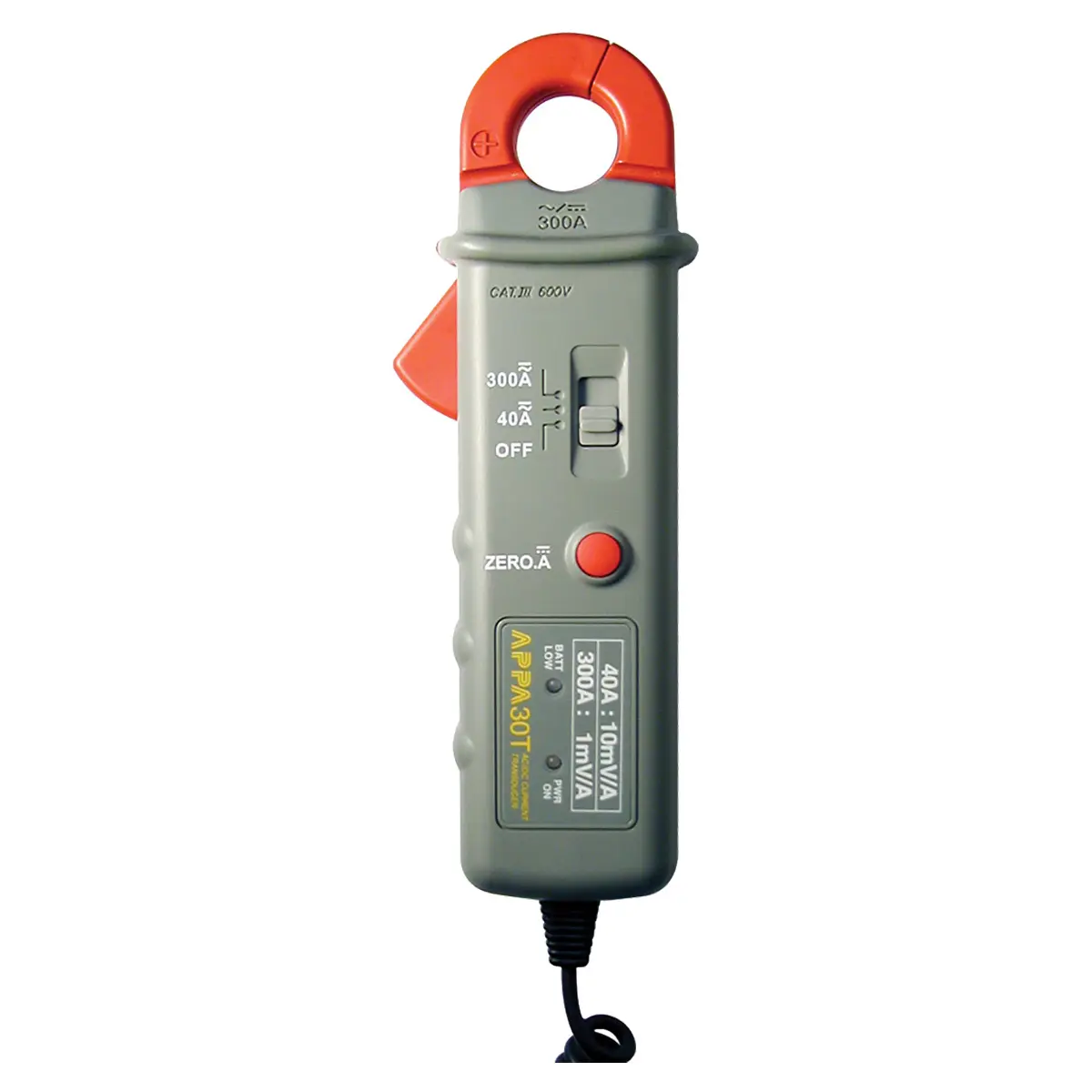 Включение и выбор пределов измерений, с установкой соответствующего коэффициента преобразования, выполняется отдельным переключателем. Предусмотренная в APPA 30Т функция установки нуля в режиме измерения силы тока минимизирует погрешность, которая может возникнуть из-за остаточной намагниченности сердечника датчика.