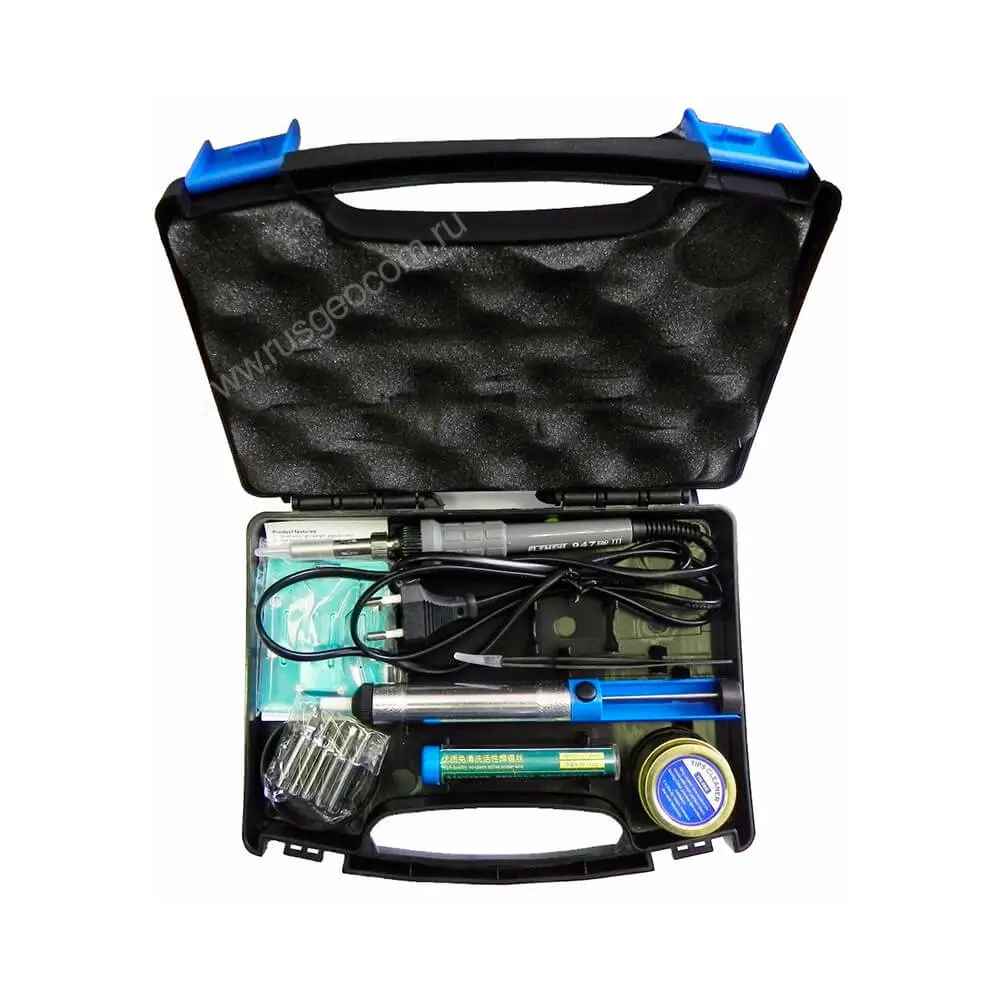 Element 947-III станет одним из самых востребованных наборов инструментов Вашего домашнего оснащения, ведь именно при помощи паяльника можно осуществить пайку и распайку самых различных материалов, будь то блок питания, микросхема или система электропроводки, то есть, всего того, что нас окружает в повседневной жизни. При этом сопутствующие элементы в виде оловотсоса, пинцета и очистителя позволят производить паяльные работы в полной мере и без необходимости докупать эти инструменты отдельно. Эргономичный дизайн рукояти паяльника, которая противостоит нагреву и обладает удобным хватом предполагает так же размещение функциональной детали инструмента - регулятора температур, благодаря которому легко и быстро можно задать оптимальный нагрев жала в соответствии с видом производимых работ.